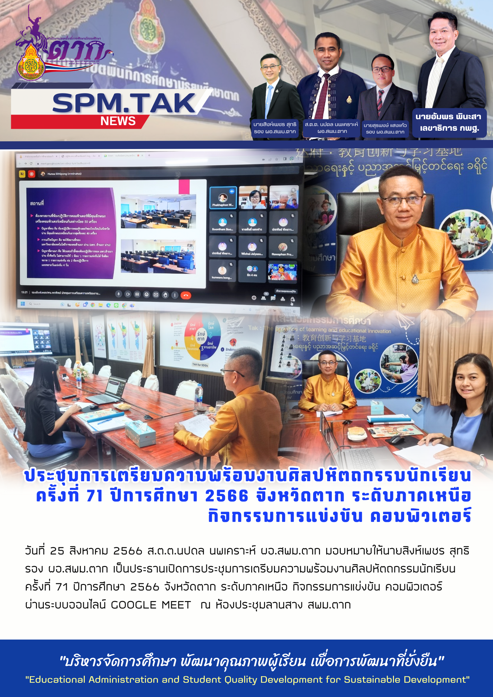 วันที่ 25 สิงหาคม 2566 ส.ต.ต.นปดล นพเคราะห์ ผอ.สพม.ตาก มอบหมายให้นายสิงห์เพชร สุทธิ รอง ผอ.สพม.ตาก เป็นประธานเปิดการประชุมการเตรียมความพร้อมงานศิลปหัตถกรรมนักเรียน ครั้งที่ 71 ปีการศึกษา 2566 จังหวัดตาก ระดับภาคเหนือ กิจกรรมการแข่งขัน คอมพิวเตอร์ ผ่านระบบออนไลน์ Google Meet ณ ห้องประชุมลานสาง สพม.ตาก
