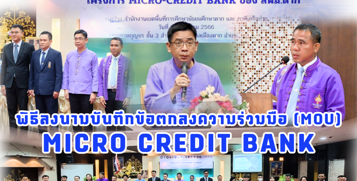 วันที่ 29 สิงหาคม 2566 สำนักงานเขตพื้นที่การศึกษามัธยมศึกษาตาก จัดพิธีลงนามบันทึก ข้อตกลงความร่วมมือ (MOU) ขับเคลื่อนโครงการ MICRO CREDIT BANK สพม.ตาก ร่วมกับ 19 หน่วยงานภาคีเครือข่าย โดยมีนายสวนิต สุริยกุล ณ อยุธยา รองผู้ว่าราชการ จังหวัดตาก เป็นประธานในพิธี และ ส.ต.ต.นปดล นพเคราะห์ ผอ.สพม.ตาก เป็นผู้กล่าวรายงานโครงการ ณ ห้องประชุมเศวตกุญชร ชั้น 3 สำนักงานเทศบาลเมืองตาก จังหวัดตาก