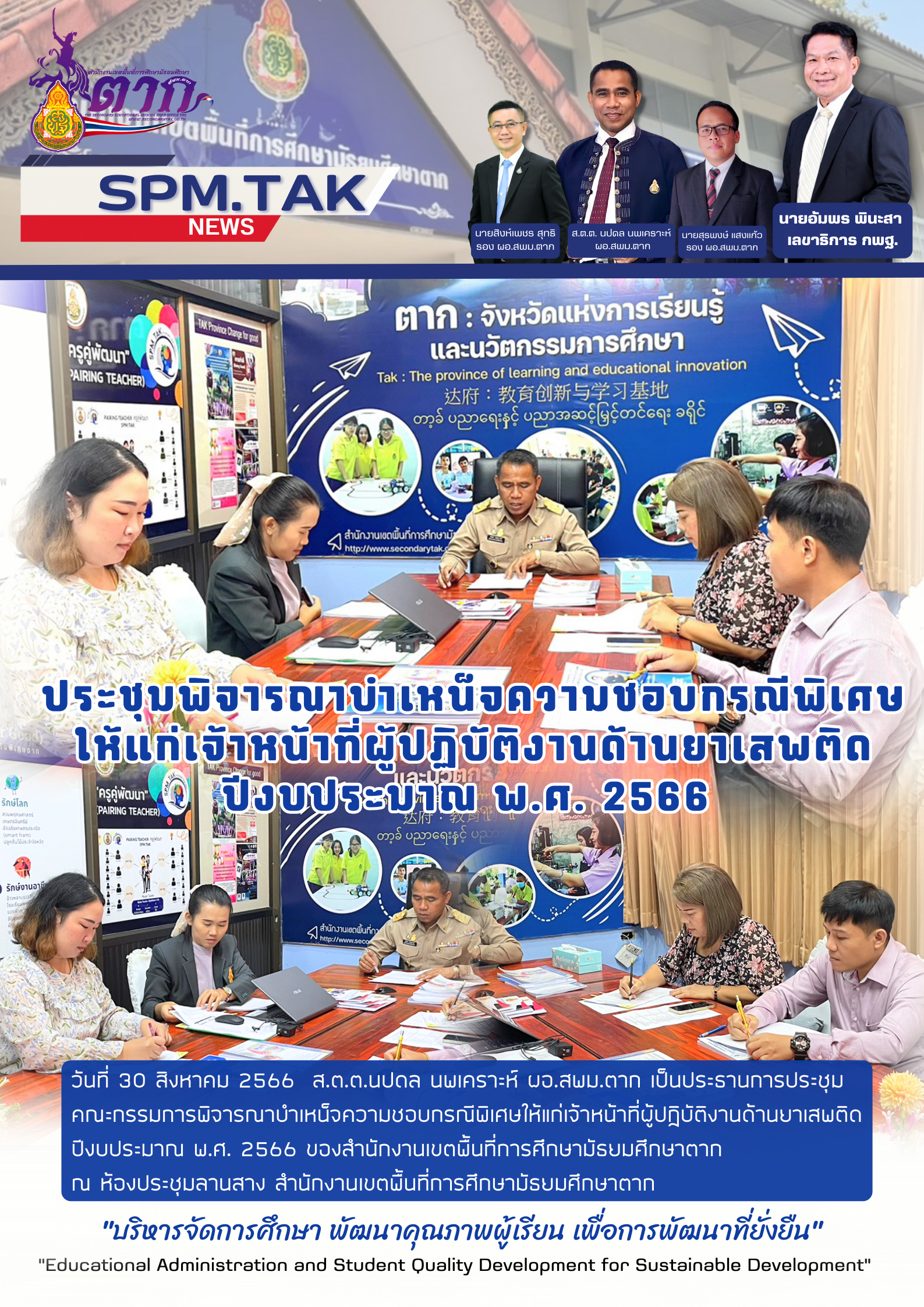 วันที่ 30 สิงหาคม 2566 ส.ต.ต.นปดล นพเคราะห์ ผอ.สพม.ตาก เป็นประธานการประชุม คณะกรรมการพิจารณาบำเหน็จความชอบกรณีพิเศษให้แก่เจ้าหน้าที่ผู้ปฏิบัติงานด้านยาเสพติด ปีงบประมาณ พ.ศ. 2566 ของสำนักงานเขตพื้นที่การศึกษามัธยมศึกษาตาก ณ ห้องประชุมลานสาง สำนักงานเขตพื้นที่การศึกษามัธยมศึกษาตาก