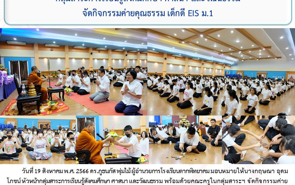 วันที่ 19 สิงหาคม พ.ศ. 2566 ดร.ภูธนภัส พุ่มไม้ ผู้อำนวยการโรงเรียนตากพิทยาคม มอบหมายให้นางกฤษณา อุดมโภชน์ หัวหน้ากลุ่มสาระการเรียนรู้สังคมศึกษา ศาสนา และวัฒนธรรม พร้อมด้วยคณะครูในกลุ่มสาระฯ จัดกิจกรรมค่ายคุณธรรม เด็กดี EIS ม.1 โดยมีวัตถุประสงค์เพื่อให้นักเรียนได้แสดงตนเป็นพุทธมามกะ ตระหนักถึงการประพฤติ ปฏิบัติตนเป็นชาวพุทธที่ดี มีความซื่อสัตย์ สุจริต และคุณลักษณะอันพึงประสงค์บนพื้นฐานของหลักปรัชญาของเศรษฐกิจพอเพียง ณ หอประชุมกาญจนาภิเษก 1 โรงเรียนตากพิทยาคม