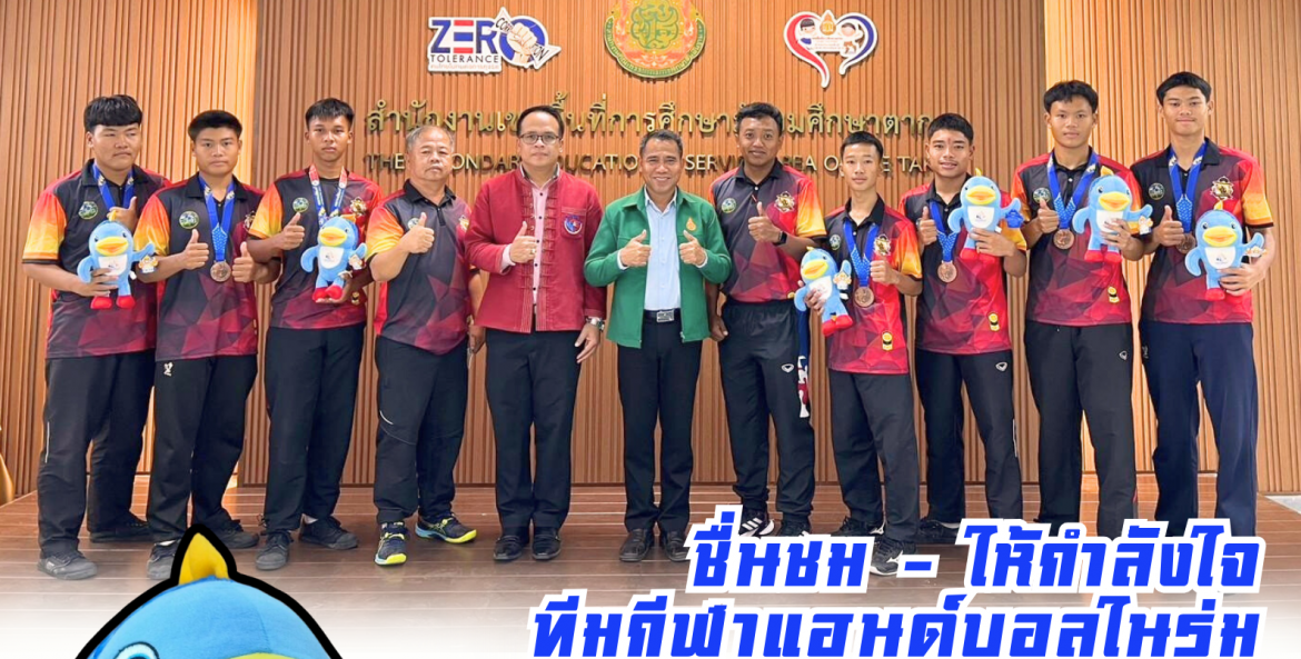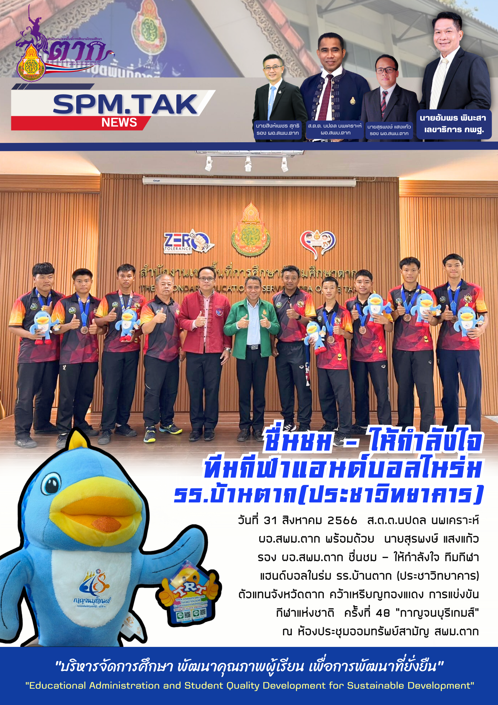 วันที่ 31 สิงหาคม 2566 ส.ต.ต.นปดล นพเคราะห์ ผอ.สพม.ตาก พร้อมด้วย นายสุรพงษ์ แสงแก้ว รอง ผอ.สพม.ตาก ชื่นชม – ให้กำลังใจ ทีมกีฬาแฮนด์บอลในร่ม รร.บ้านตาก(ประชาวิทยาคาร )ตัวแทนจังหวัดตาก คว้าเหรียญทองแเดง การแข่งขันกีฬาแห่งชาติ ครั้งที่ 48 “กาญจนบุรีเกมส์” ณ ห้องประชุมออมทรัพย์สามัญ สพม.ตาก