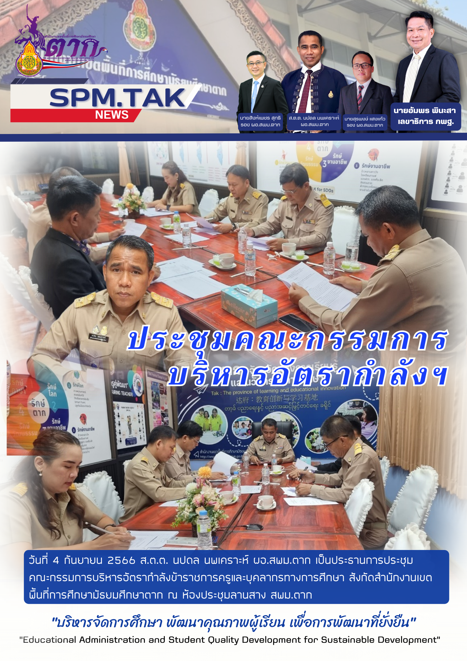 ประชุมคณะกรรมการบริหารอัตรากำลังฯ วรวุฒิ เนื้อนิ่ม 5 กันยายน 2566 วันที่ 4 กันยายน 2566 ส.ต.ต. นปดล นพเคราะห์ ผอ.สพม.ตาก เป็นประธานการประชุม คณะกรรมการบริหารอัตรากำลังข้าราชการครูและบุคลากรทางการศึกษา สังกัดสำนักงานเขต พื้นที่การศึกษามัธยมศึกษาตาก ณ ห้องประชุมลานสาง สพม.ตาก จำนวนคนดู 35