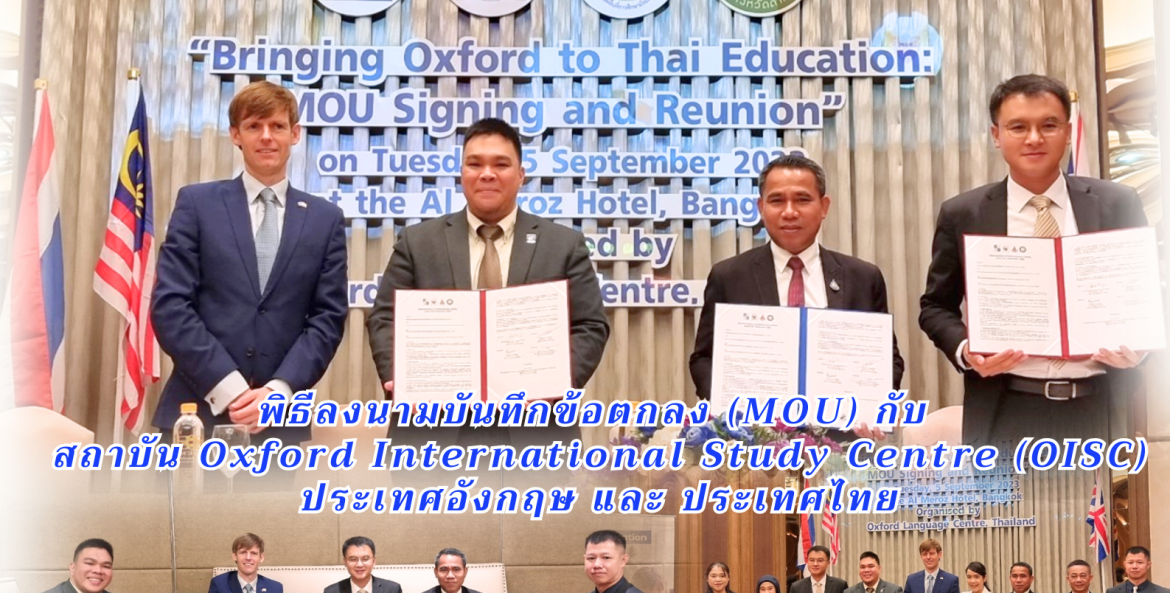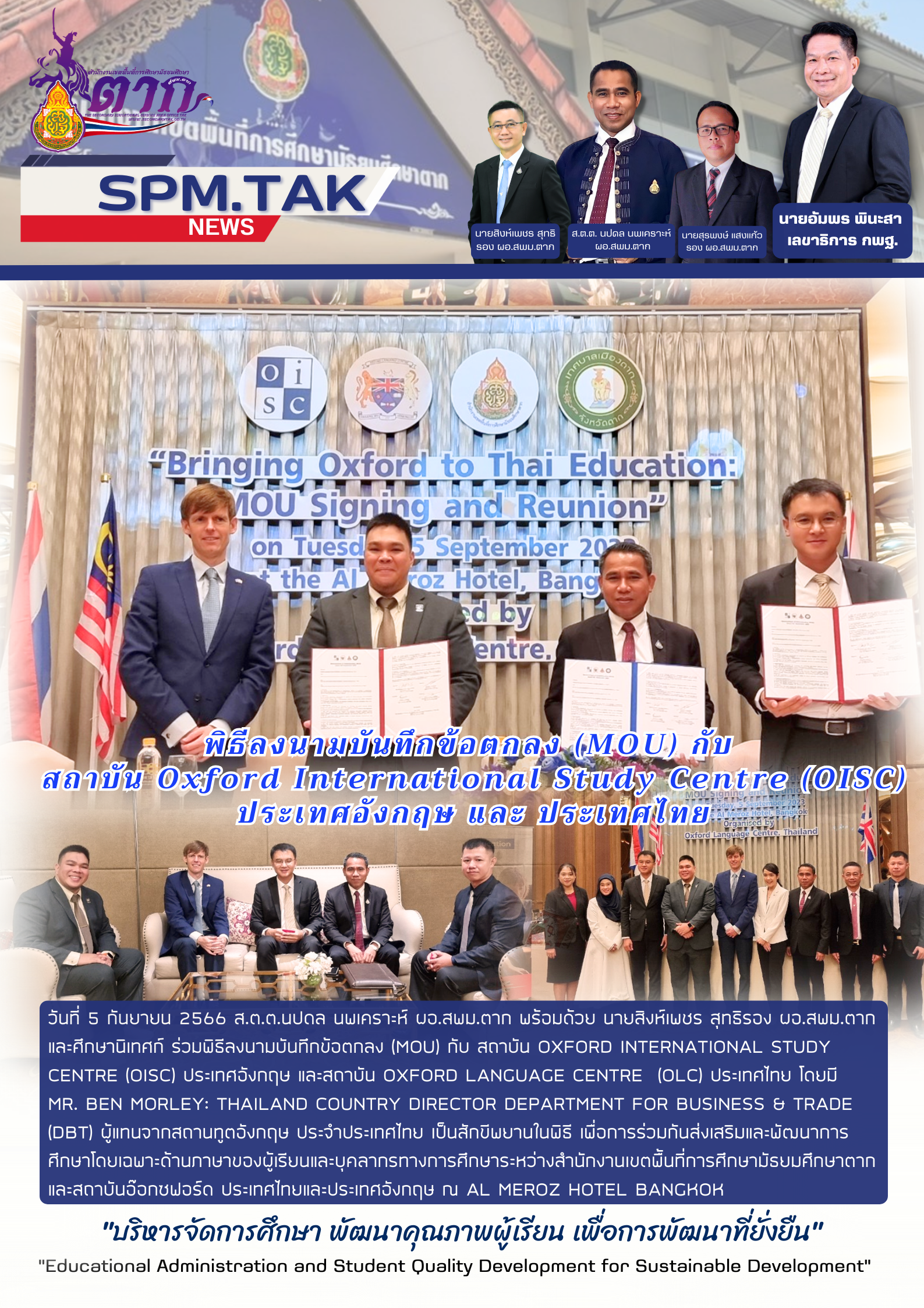 วันที่ 5 กันยายน 2566 ส.ต.ต.นปดล นพเคราะห์ ผอ.สพม.ตาก พร้อมด้วย นายสิงห์เพชร สุทธิรอง ผอ.สพม.ตาก และศึกษานิเทศก์ ร่วมพิธีลงนามบันทึกข้อตกลง (MOU) กับ สถาบัน Oxford International Study Centre (OISC) ประเทศอังกฤษ และสถาบัน Oxford Language Centre (OLC) ประเทศไทย โดยมี Mr. Ben Morley: Thailand Country Director Department for Business & Trade (DBT) ผู้แทนจากสถานทูตอังกฤษ ประจำประเทศไทย เป็นสักขีพยานในพิธี เพื่อการร่วมกันส่งเสริมและพัฒนาการ ศึกษาโดยเฉพาะด้านภาษาของผู้เรียนและบุคลากรทางการศึกษาระหว่างสำนักงานเขตพื้นที่การศึกษามัธยมศึกษาตากและสถาบันอ๊อกซฟอร์ด ประเทศไทยและประเทศอังกฤษ ณ Al Meroz Hotel Bangkok