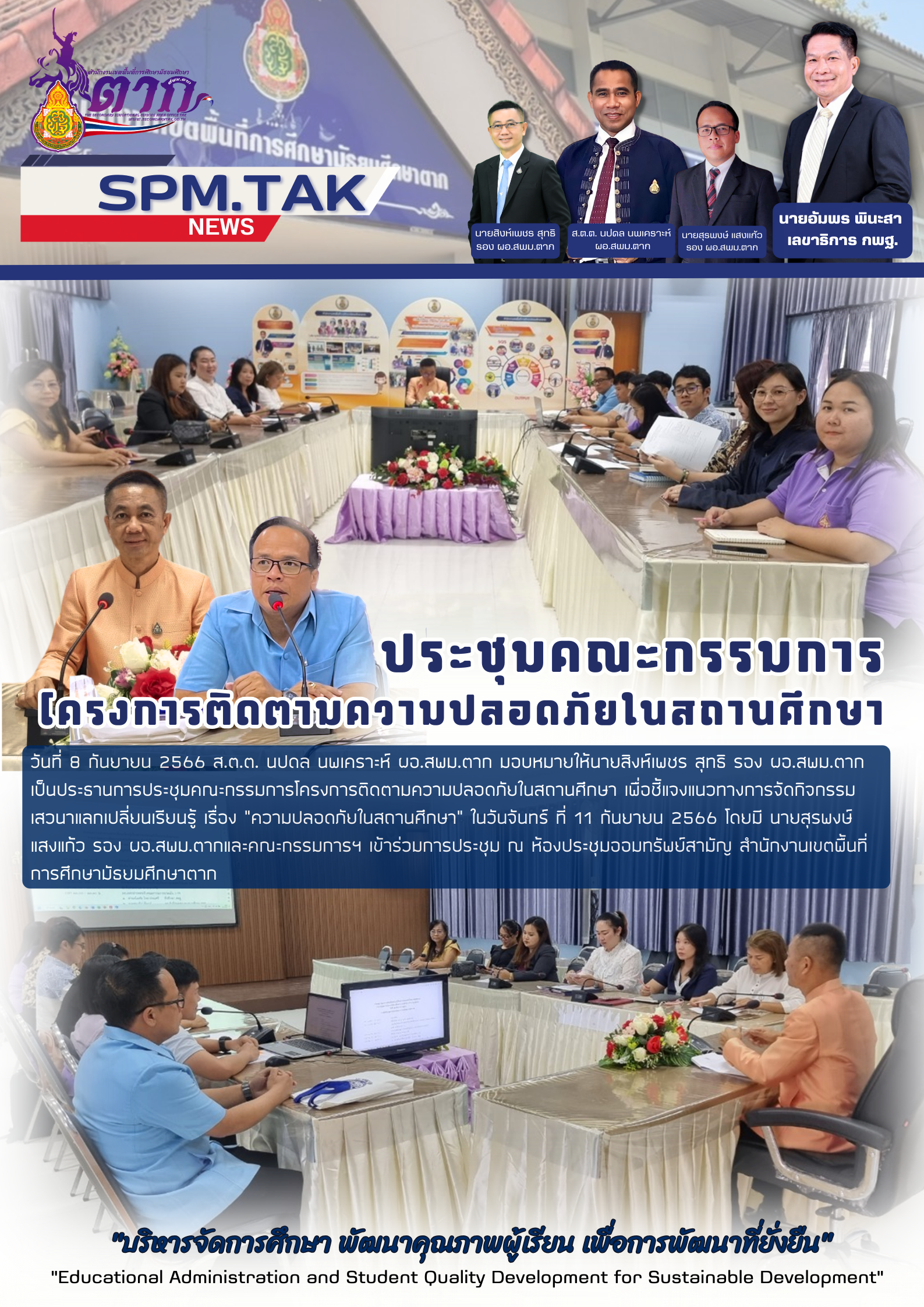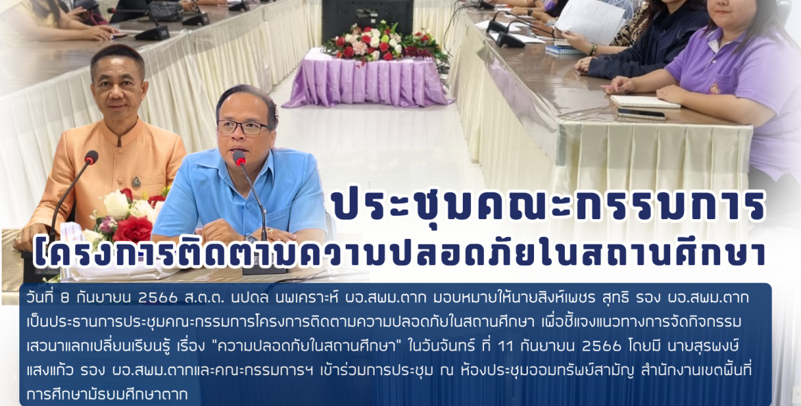 วันที่ 8 กันยายน 2566 ส.ต.ต. นปดล นพเคราะห์ ผอ.สพม.ตาก มอบหมายให้นายสิงห์เพชร สุทธิ รอง ผอ.สพม.ตาก เป็นประธานการประชุมคณะกรรมการโครงการติดตามความปลอดภัยในสถานศึกษา เพื่อชี้แจงแนวทางการจัดกิจกรรม เสวนาแลกเปลี่ยนเรียนรู้ เรื่อง “ความปลอดภัยในสถานศึกษา” ในวันจันทร์ ที่ 11 กันยายน 2566 โดยมี นายสุรพงษ์ แสงแก้ว รอง ผอ.สพม.ตากและคณะกรรมการฯ เข้าร่วมการประชุม ณ ห้องประชุมออมทรัพย์สามัญ สำนักงานเขตพื้นที่ การศึกษามัธยมศึกษาตาก