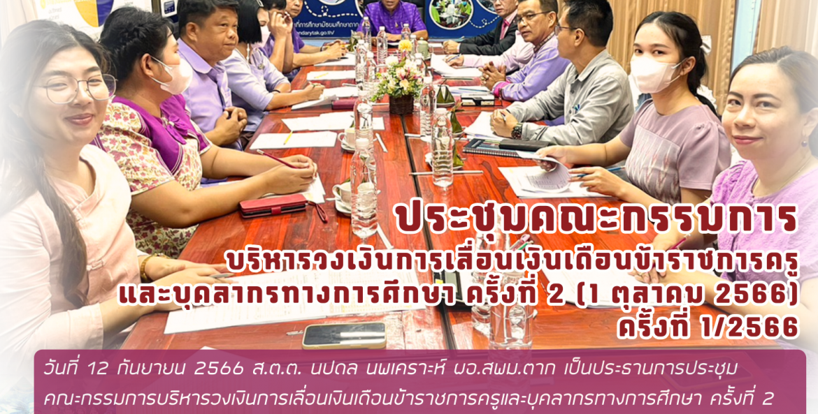 วันที่ 12 กันยายน 2566 ส.ต.ต. นปดล นพเคราะห์ ผอ.สพม.ตาก เป็นประธานการประชุม คณะกรรมการบริหารวงเงินการเลื่อนเงินเดือนข้าราชการครูและบุคลากรทางการศึกษา ครั้งที่ 2 (1 ตุลาคม 2566) ครั้งที่ 1/2566 ณ ห้องประชุมลานสาง สำนักงานเขตพื้นที่การศึกษา มัธยมศึกษาตาก อำเภอเมืองตาก จังหวัดตาก