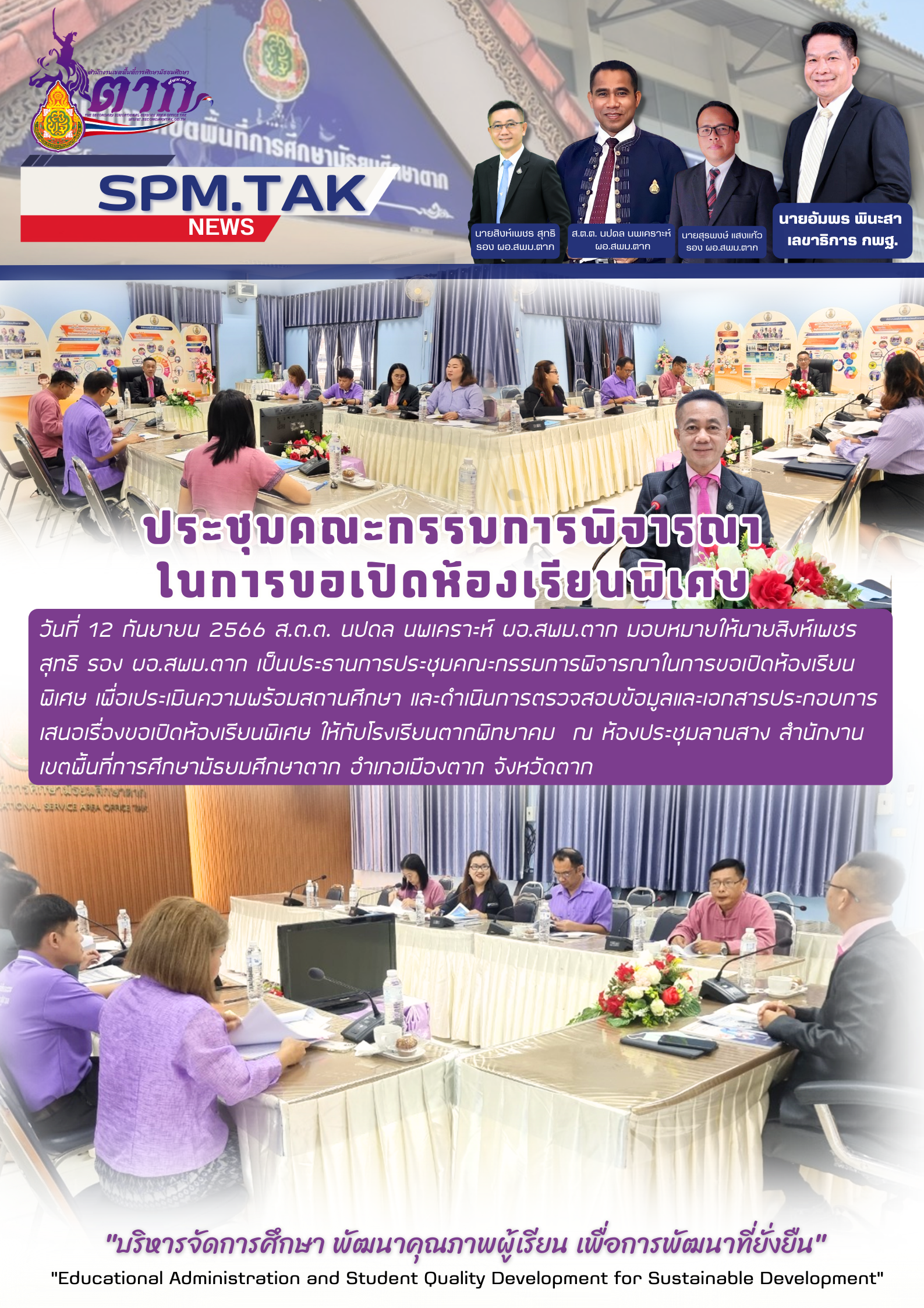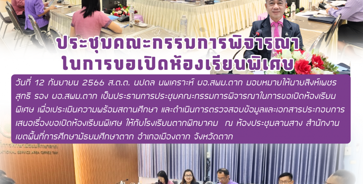 วันที่ 12 กันยายน 2566 ส.ต.ต. นปดล นพเคราะห์ ผอ.สพม.ตาก มอบหมายให้นายสิงห์เพชร สุทธิ รอง ผอ.สพม.ตาก เป็นประธานการประชุมคณะกรรมการพิจารณาในการขอเปิดห้องเรียน พิเศษ เพื่อเประเมินความพร้อมสถานศึกษา และดำเนินการตรวจสอบข้อมูลและเอกสารประกอบการเสนอเรื่องขอเปิดห้องเรียนพิเศษ ให้กับโรงเรียนตากพิทยาคม ณ ห้องประชุมลานสาง สำนักงาน เขตพื้นที่การศึกษามัธยมศึกษาตาก อำเภอเมืองตาก จังหวัดตาก