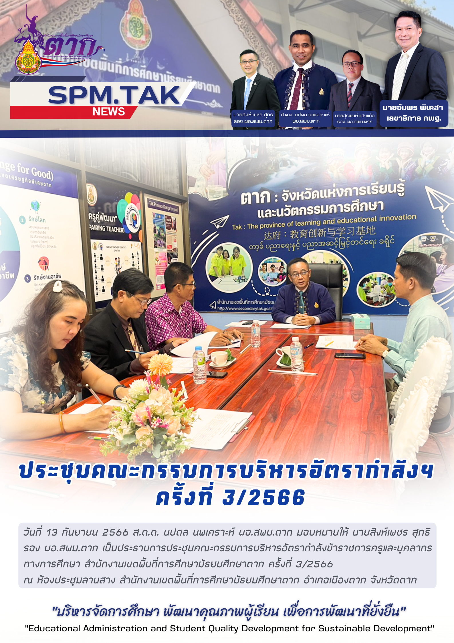 วันที่ 13 กันยายน 2566 ส.ต.ต. นปดล นพเคราะห์ ผอ.สพม.ตาก มอบหมายให้ นายสิงห์เพชร สุทธิ รอง ผอ.สพม.ตาก เป็นประธานการประชุมคณะกรรมการบริหารอัตรากำลังข้าราชการครูและบุคลากรทางการศึกษา สำนักงานเขตพื้นที่การศึกษามัธยมศึกษาตาก ครั้งที่ 3/2566 ณ ห้องประชุมลานสาง สำนักงานเขตพื้นที่การศึกษามัธยมศึกษาตาก อำเภอเมืองตาก จังหวัดตาก