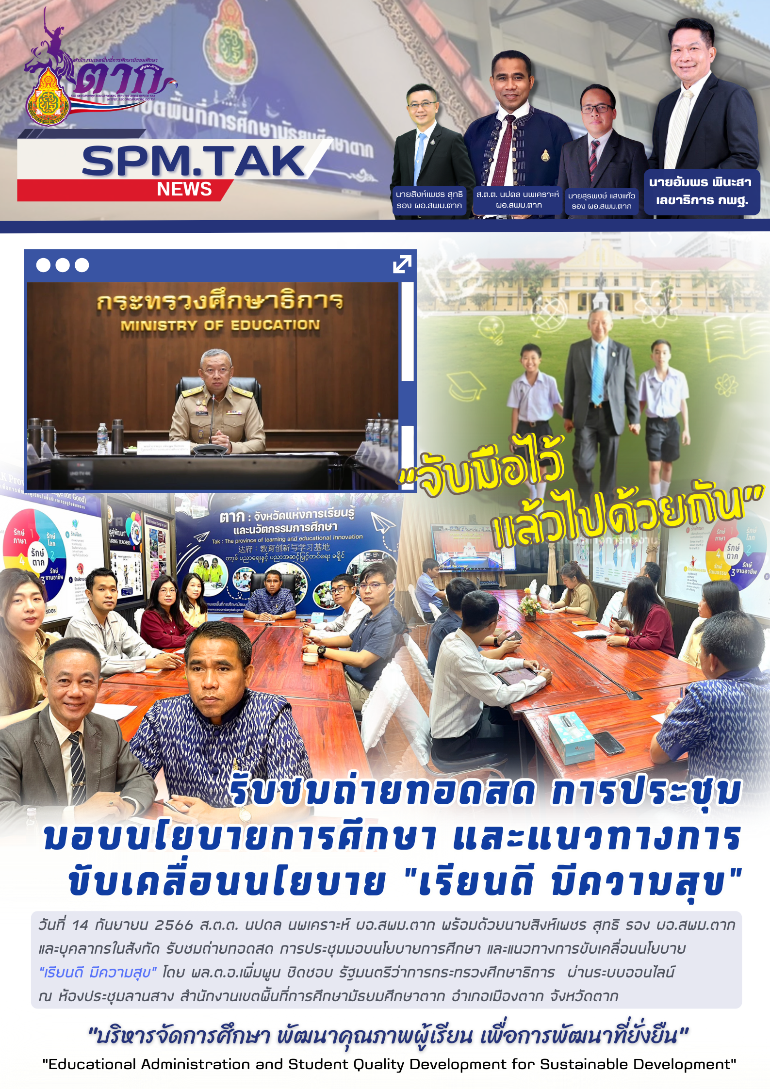วันที่ 14 กันยายน 2566 ส.ต.ต. นปดล นพเคราะห์ ผอ.สพม.ตาก พร้อมด้วยนายสิงห์เพชร สุทธิ รอง ผอ.สพม.ตากและบุคลากรในสังกัด รับชมถ่ายทอดสด การประชุมมอบนโยบายการศึกษา และแนวทางการขับเคลื่อนนโยบาย “เรียนดี มีความสุข” โดย พล.ต.อ.เพิ่มพูน ชิดชอบ รัฐมนตรีว่าการกระทรวงศึกษาธิการ ผ่านระบบออนไลน์ ณ ห้องประชุมลานสาง สำนักงานเขตพื้นที่การศึกษามัธยมศึกษาตาก อำเภอเมืองตาก จังหวัดตาก