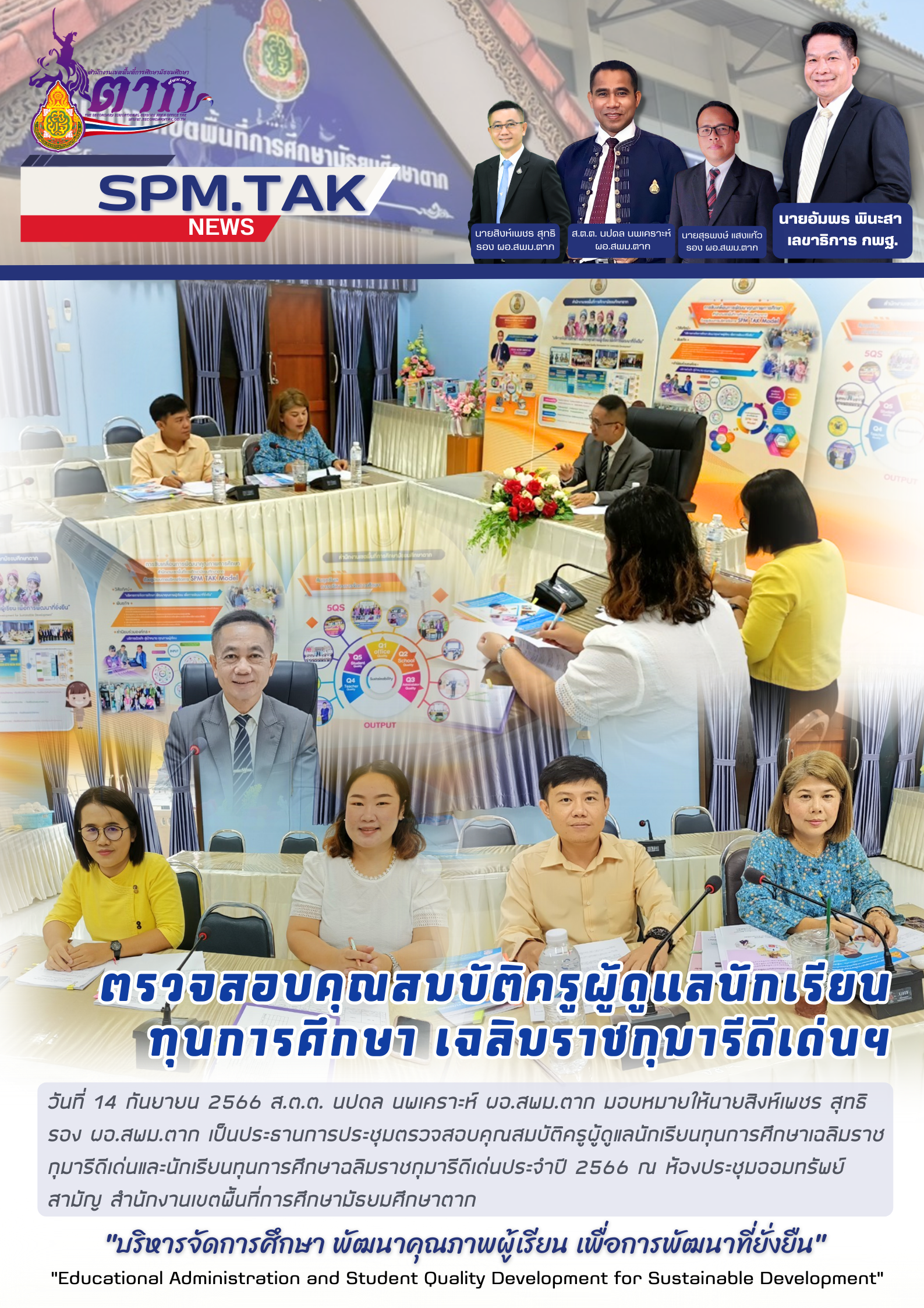 วันที่ 14 กันยายน 2566 ส.ต.ต. นปดล นพเคราะห์ ผอ.สพม.ตาก มอบหมายให้นายสิงห์เพชร สุทธิ รอง ผอ.สพม.ตาก เป็นประธานการประชุมตรวจสอบคุณสมบัติครูผู้ดูแลนักเรียนทุนการศึกษาเฉลิมราชกุมารีดีเด่นและนักเรียนทุนการศึกษาฉลิมราชกุมารีดีเด่นประจำปี 2566 ณ ห้องประชุมออมทรัพย์ สามัญ สำนักงานเขตพื้นที่การศึกษามัธยมศึกษาตาก