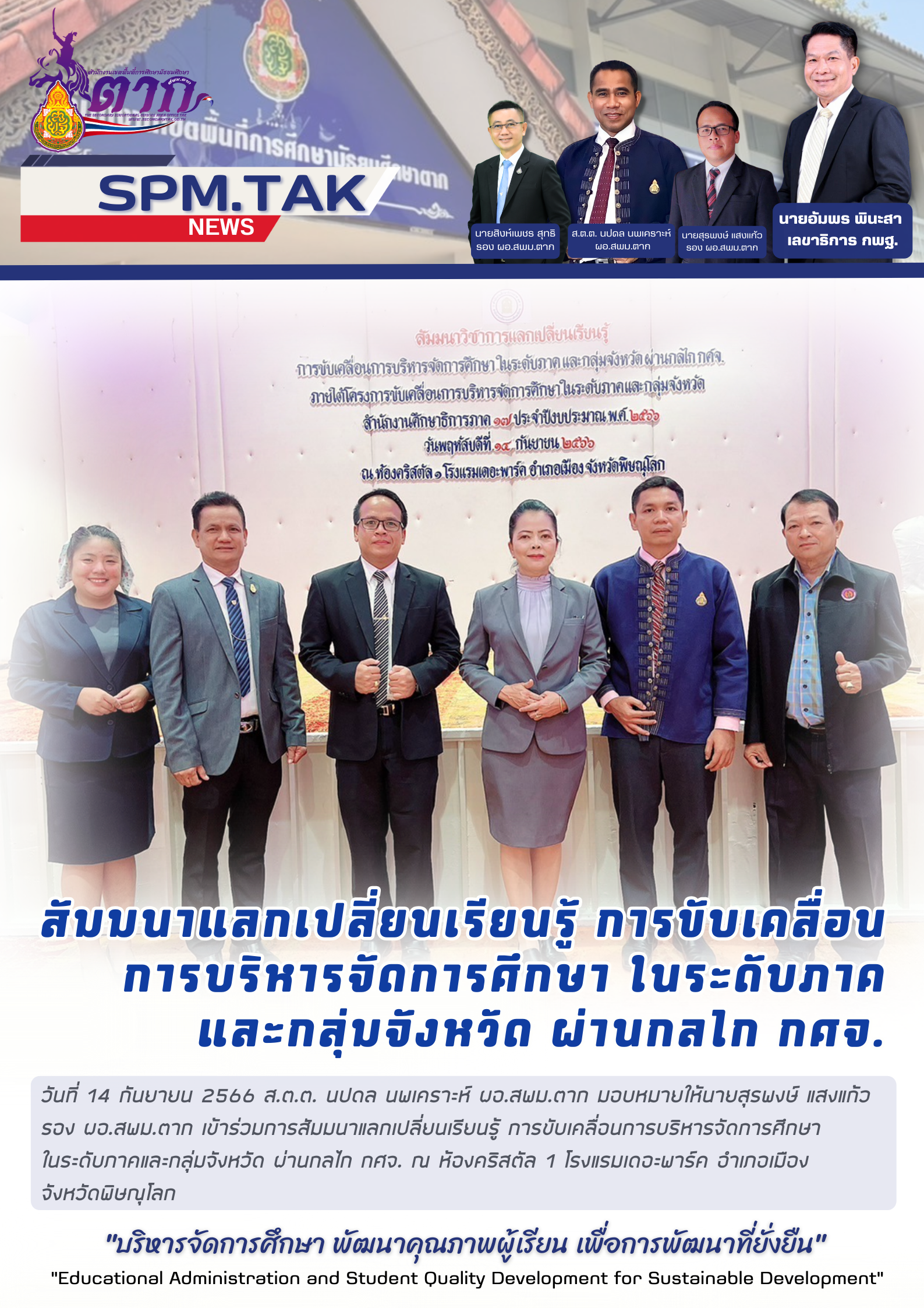 วันที่ 14 กันยายน 2566 ส.ต.ต. นปดล นพเคราะห์ ผอ.สพม.ตาก มอบหมายให้นายสุรพงษ์ แสงแก้ว รอง ผอ.สพม.ตาก เข้าร่วมการสัมมนาแลกเปลี่ยนเรียนรู้ การขับเคลื่อนการบริหารจัดการศึกษา ในระดับภาคและกลุ่มจังหวัด ผ่านกลไก กศจ. ณ ห้องคริสตัล 1 โรงแรมเดอะพาร์ค อำเภอเมือง จังหวัดพิษณุโลก