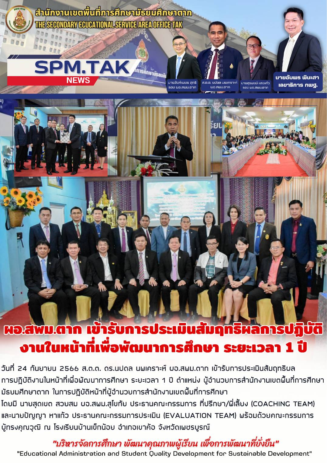 วันที่ 24 กันยายน 2566 ส.ต.ต. ดร.นปดล นพเคราะห์ ผอ.สพม.ตาก เข้ารับการประเมินสัมฤทธิผล การปฏิบัติงานในหน้าที่เพื่อพัฒนาการศึกษา ระยะเวลา 1 ปี ตำแหน่ง ผู้อำนวยการสำนักงานเขตพื้นที่การศึกษามัธยมศึกษาตาก ในการปฏิบัติหน้าที่ผู้อำนวยการสำนักงานเขตพื้นที่การศึกษา โดยมี นายสุดเขต สวยสม ผอ.สพม.สุโขทัย ประธานคณะกรรมการ ที่ปรึกษา/พี่เลี้ยง (Coaching Team) และนายปัญญา หาแก้ว ประธานคณะกรรมการประเมิน (Evaluation Team) พร้อมด้วยคณะกรรมการผู้ทรงคุณวุฒิ ณ โรงเรียนบ้านเข็กน้อย อำเภอเขาค้อ จังหวัดเพชรบูรณ์