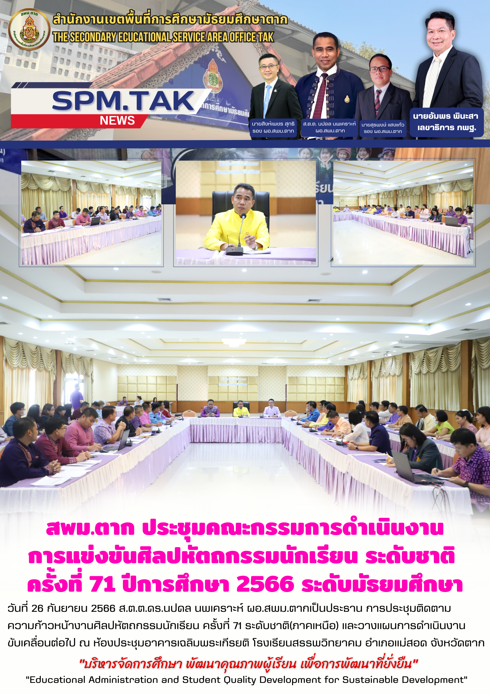 วันที่ 26 กันยายน 2566 ส.ต.ต.ดร.นปดล นพเคราะห์ ผอ.สพม.ตากเป็นประธาน การประชุมติดตาม ความก้าวหน้างานศิลปหัตถกรรมนักเรียน ครั้งที่ 71 ระดับชาติ(ภาคเหนือ) และวางแผนการดำเนินงาน ขับเคลื่อนต่อไป ณ ห้องประชุมอาคารเฉลิมพระเกีรยติ โรงเรียนสรรพวิทยาคม อำเภอแม่สอด จังหวัดตาก
