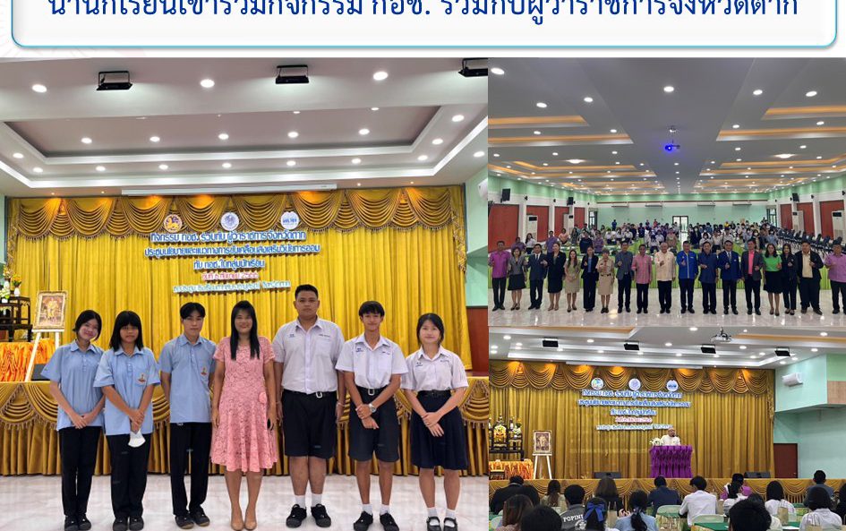 วันที่ 6 กันยายน พ.ศ. 2566 ดร.ภูธนภัส พุ่มไม้ ผู้อำนวยการโรงเรียนตากพิทยาคม มอบหมายให้ นางสาวณัฐธิดา ทิอุด รองผู้อำนวยการโรงเรียนตากพิทยาคม นำนักเรียนเข้าร่วมกิจกรรม กอช. ร่วมกับผู้ว่าราชการจังหวัดตาก ประชุมมอบนโยบายและแนวทางการขับเคลื่อนส่งเสริมวินัยการออมกับ กอช. ในกลุ่มนักเรียน ณ อาคารหอประชุมใหญ่ โรงเรียนตากสินราชานุสรณ์ อำเภอเมืองตาก จังหวัดตาก