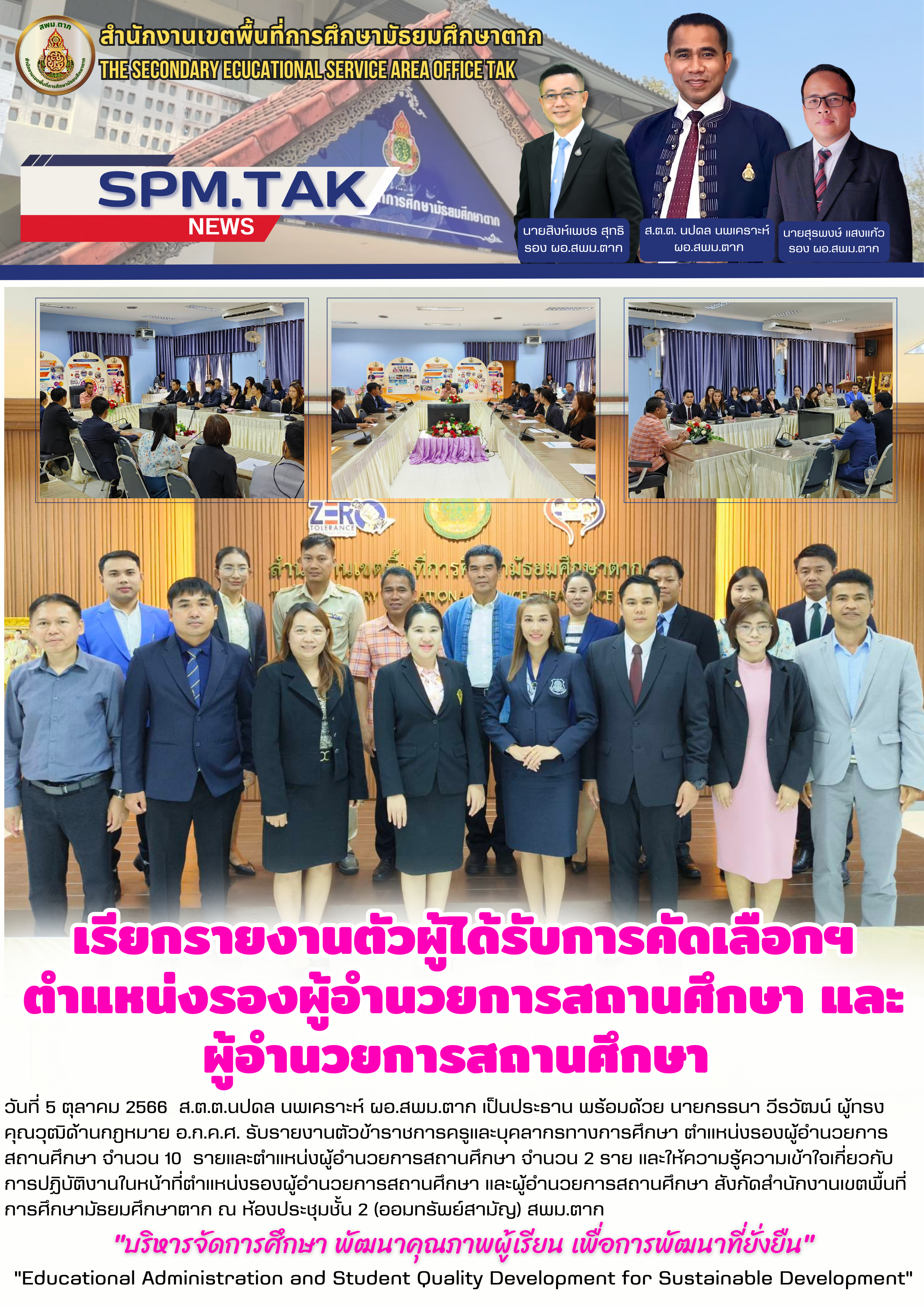 วันที่ 5 ตุลาคม 2566 ส.ต.ต.นปดล นพเคราะห์ ผอ.สพม.ตาก เป็นประธาน พร้อมด้วย นายกรธนา วีรวัฒน์ ผู้ทรงคุณวุฒิด้านกฎหมาย อ.ก.ค.ศ. รับรายงานตัวข้าราชการครูและบุคลากรทางการศึกษา ตำแหน่งรองผู้อำนวยการสถานศึกษา จำนวน 10 รายและตำแหน่งผู้อำนวยการสถานศึกษา จำนวน 2 ราย และให้ความรู้ความเข้าใจเกี่ยวกับการปฏิบัติงานในหน้าที่ตำแหน่งรองผู้อำนวยการสถานศึกษา และผู้อำนวยการสถานศึกษา สังกัดสำนักงานเขตพื้นที่การศึกษามัธยมศึกษาตาก ณ ห้องประชุมชั้น 2 (ออมทรัพย์สามัญ) สพม.ตาก
