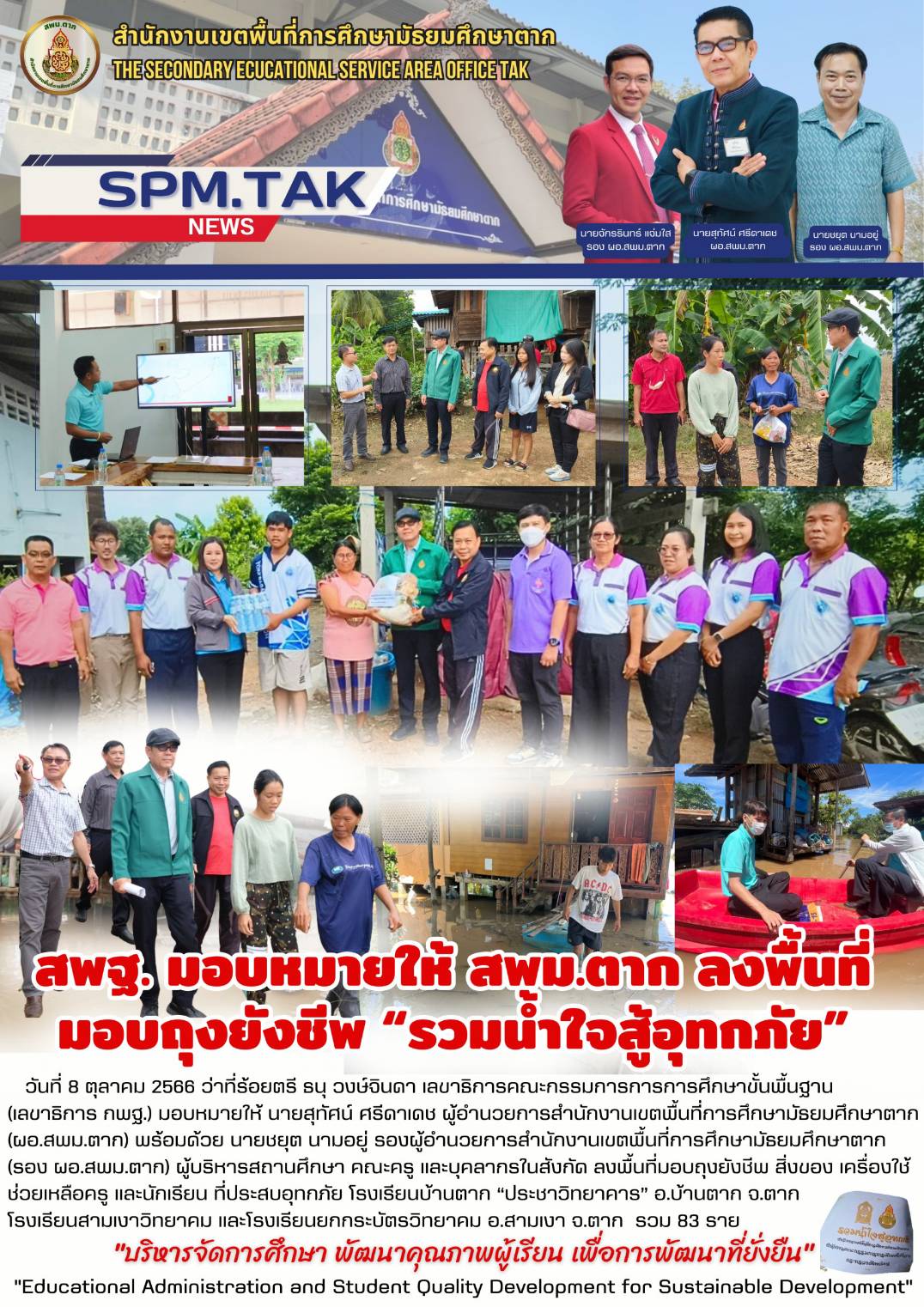 วันที่ 8 ตุลาคม 2566 ว่าที่ร้อยตรี ธนุ วงษ์จินดา เลขาธิการคณะกรรมการการการศึกษาขั้นพื้นฐาน (เลขาธิการ กพฐ.) มอบหมายให้ นายสุทัศน์ ศรีดาเดช ผู้อำนวยการสำนักงานเขตพื้นที่การศึกษามัธยมศึกษาตาก (ผอ.สพม.ตาก) พร้อมด้วย นายชยุต นามอยู่ รองผู้อำนวยการสำนักงานเขตพื้นที่การศึกษามัธยมศึกษาตาก (รอง ผอ.สพม.ตาก) ผู้บริหารสถานศึกษา คณะครู และบุคลากรในสังกัด ลงพื้นที่มอบถุงยังชีพ สิ่งของ เครื่องใช้ ช่วยเหลือครู และนักเรียน ที่ประสบอุทกภัย โรงเรียนบ้านตาก “ประชาวิทยาคาร” อ.บ้านตาก จ.ตาก โรงเรียนสามเงาวิทยาคม และโรงเรียนยกกระบัตรวิทยาคม อ.สามเงา จ.ตาก รวม 83 ราย