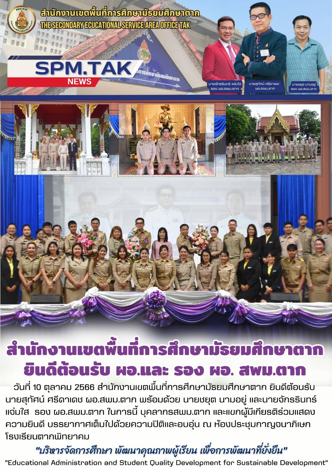 วันที่ 9 ตุลาคม 2566 สำนักงานเขตพื้นที่การศึกษามัธยมศึกษาตาก ยินดีต้อนรับ นายสุทัศน์ ศรีดาเดช ผอ.สพม.ตาก พร้อมด้วย นายชยุต นามอยู่ และนายจักรรินทร์ แจ่มใส รอง ผอ.สพม.ตาก ในการนี้ บุคลากรสพม.ตาก และแขกผู้มีเกียรติร่วมแสดงความยินดี บรรยากาศเต็มไปด้วยความปิติและอบอุ่น ณ ห้องประชุมกาญจนาภิเษก โรงเรียนตากพิทยาคม