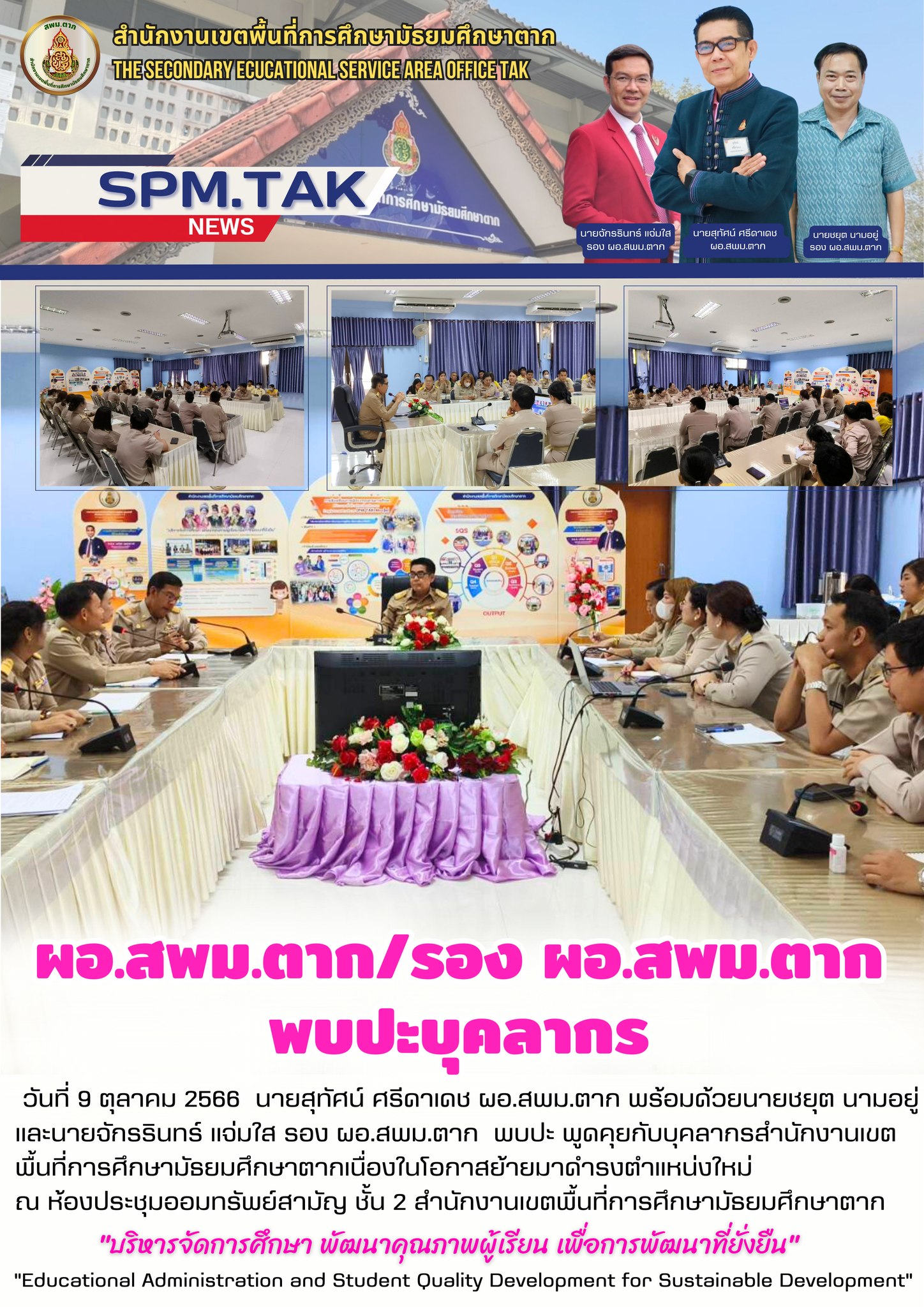วันที่ 9 ตุลาคม 2566 นายสุทัศน์ ศรีดาเดช ผอ.สพม.ตาก พร้อมด้วยนายชยุต นามอยู่ และนายจักรรินทร์ แจ่มใส รอง ผอ.สพม.ตาก พบปะ พูดคุยกับบุคลากรสำนักงานเขตพื้นที่การศึกษามัธยมศึกษาตากเนื่องในโอกาสย้ายมาดำรงตำแหน่งใหม่ ณ ห้องประชุมออมทรัพย์สามัญ ชั้น 2 สำนักงานเขตพื้นที่การศึกษามัธยมศึกษาตาก