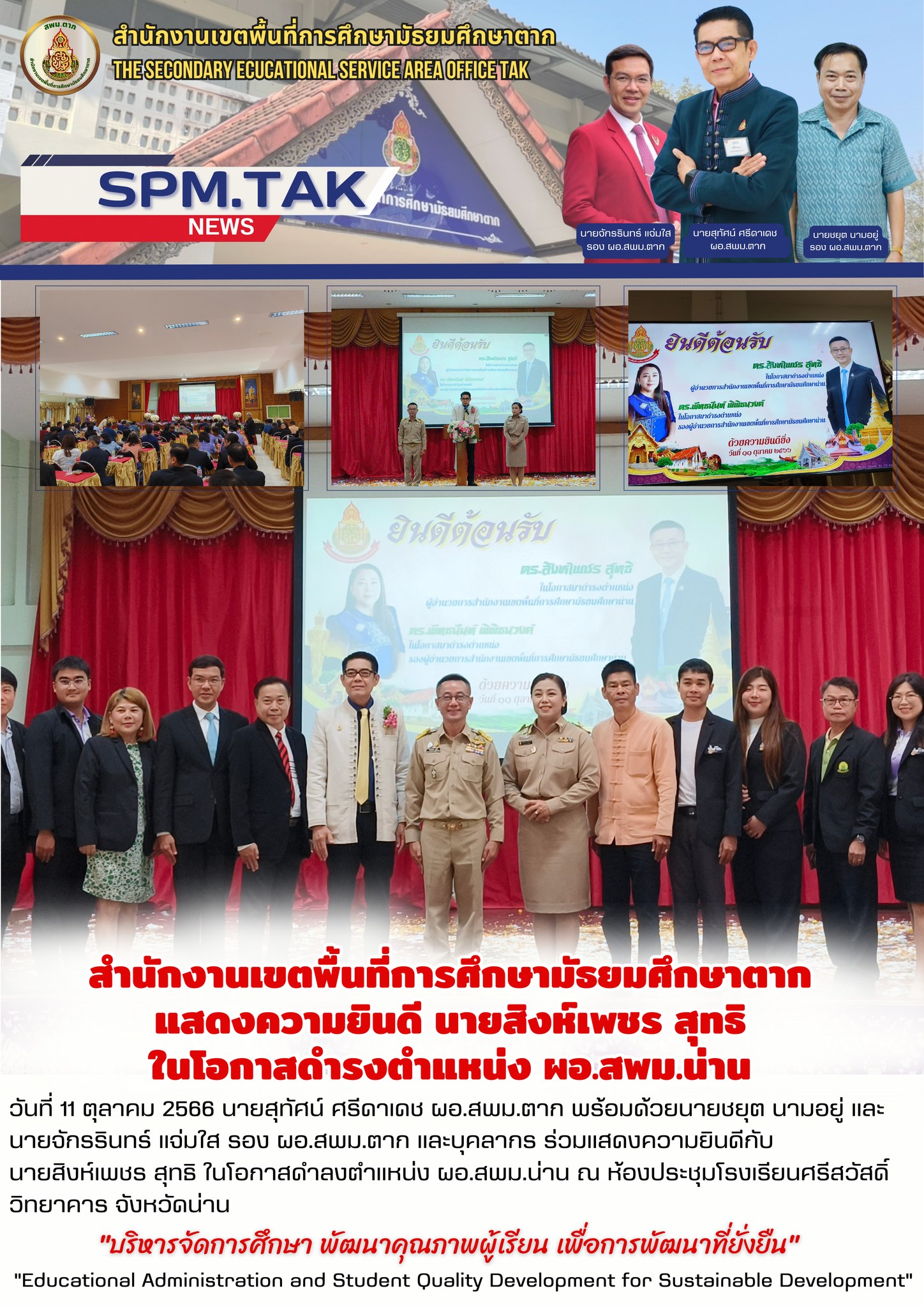 สพม.ตาก แสดงความยินดี นายสิงห์เพชร สุทธิ วรวุฒิ เนื้อนิ่ม 12 ตุลาคม 2566 วันที่ 11 ตุลาคม 2566 นายสุทัศน์ ศรีดาเดช ผอ.สพม.ตาก พร้อมด้วยนายชยุต นามอยู่ และนายจักรรินทร์ แจ่มใส รอง ผอ.สพม.ตาก และบุคลากร ร่วมแสดงความยินดีกับ นายสิงห์เพชร สุทธิ ในโอกาสดำลงตำแหน่ง ผอ.สพม.น่าน ณ ห้องประชุมโรงเรียนศรีสวัสดิ์วิทยาคาร จังหวัดน่าน จำนวนคนดู 23