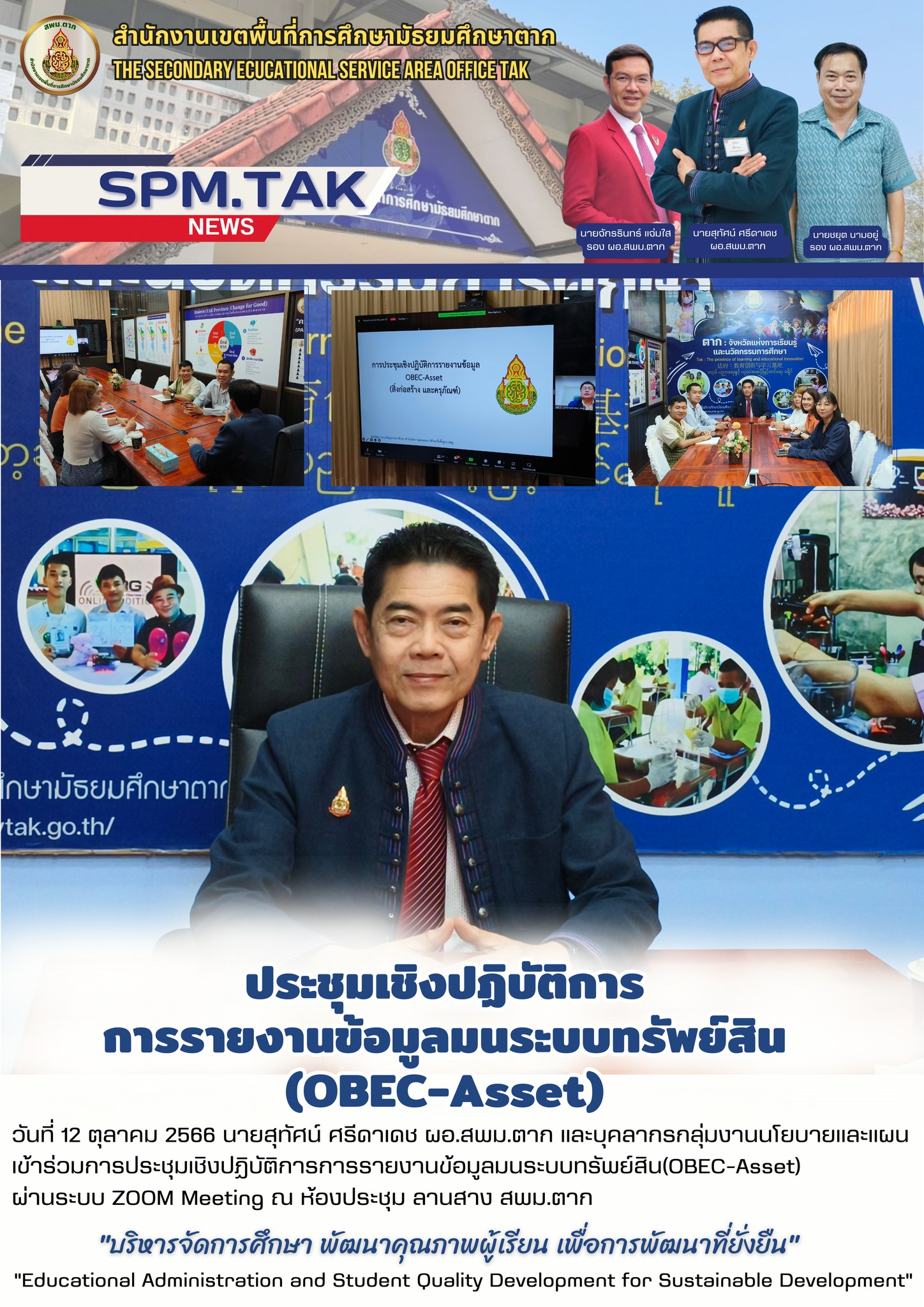 ประชุมเชิงปฏิบัติการ การรายงานข้อมูลมนระบบทรัพย์สิน (OBEC-Asset) วรวุฒิ เนื้อนิ่ม 12 ตุลาคม 2566 วันที่ 12 ตุลาคม 2566 นายสุทัศน์ ศรีดาเดช ผอ.สพม.ตาก และบุคลากรกลุ่มงานนโยบายและแผน เข้าร่วมการประชุมเชิงปฏิบัติการการรายงานข้อมูลมนระบบทรัพย์สิน(OBEC-Asset) ผ่านระบบ ZOOM Meeting ณ ห้องประชุม ลานสาง สพม.ตาก จำนวนคนดู 13