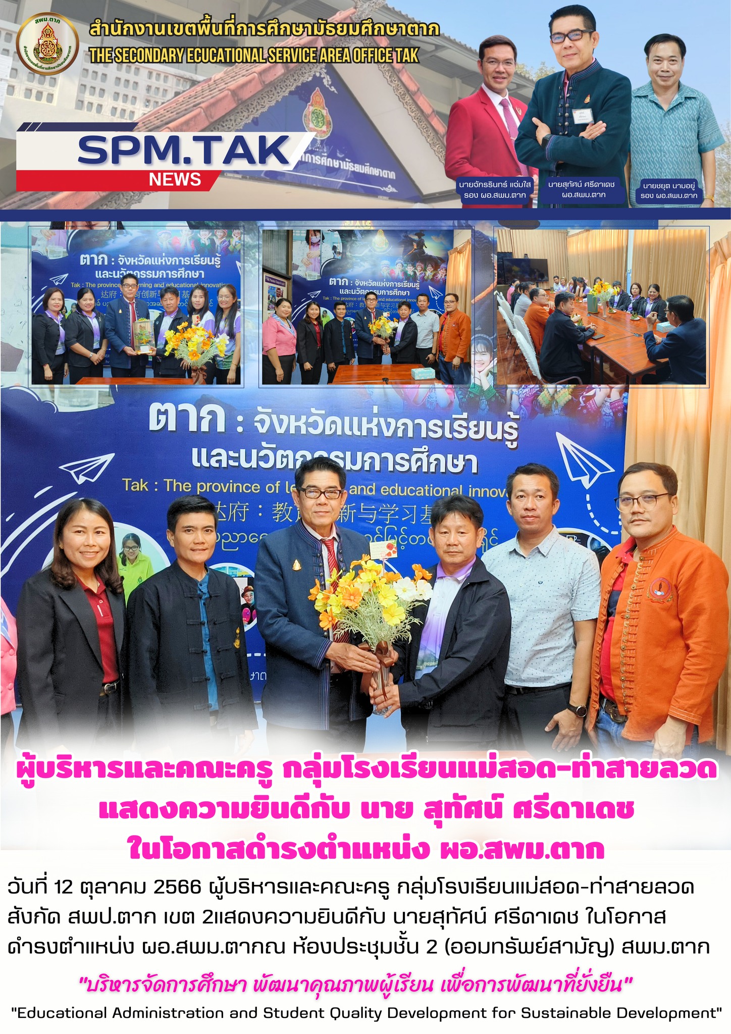 ผู้บริหารและคณะครู กลุ่มโรงเรียนแม่สอด-ท่าสายลวด วรวุฒิ เนื้อนิ่ม 12 ตุลาคม 2566 วันที่ 12 ตุลาคม 2566 ผู้บริหารและคณะครู กลุ่มโรงเรียนแม่สอด-ท่าสายลวด สังกัด สพป.ตาก เขต 2แสดงความยินดีกับ นายสุทัศน์ ศรีดาเดช ในโอกาส ดำรงตำแหน่ง ผอ.สพม.ตากณ ห้องประชุมชั้น 2 (ออมทรัพย์สามัญ) สพม.ตาก จำนวนคนดู 10