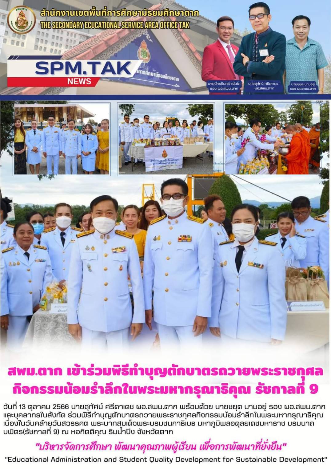 วันที่ 13 ตุลาคม 2566 นายสุทัศน์ ศรีดาเดช ผอ.สพม.ตาก พร้อมด้วย นายชยุต นามอยู่ รอง ผอ.สพม.ตาก และบุคลากรในสังกัด ร่วมพิธีทำบุญตักบาตรถวายพระราชกุศลกิจกรรมน้อมรำลึกในพระมหากรุณาธิคุณ เนื่องในวันคล้ายวันสวรรคต พระบาทสมเด็จพระบรมชนกาธิเบธ มหาภูมิพลอดุลยเดชมหาราช บรมนาถบพิตร(รัชกาลที่ 9) ณ หอกิตติคุณ ริมน้ำปิง จังหวัดตาก