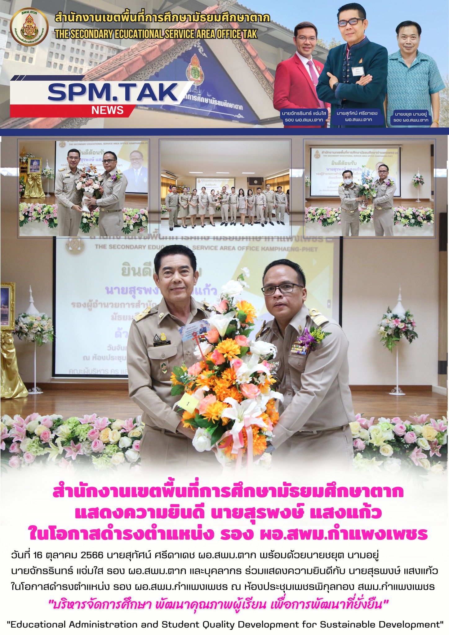 แสดงความยินดี นายสุรพงษ์ แวงแก้ว ในโอกาสดำรง รอง ผอ.สพม.กำแพงเพชร วรวุฒิ เนื้อนิ่ม 17 ตุลาคม 2566 วันที่ 16 ตุลาคม 2566 นายสุทัศน์ ศรีดาเดช ผอ.สพม.ตาก พร้อมด้วยนายชยุต นามอยู่ นายจักรรินทร์ แจ่มใส รอง ผอ.สพม.ตาก และบุคลากร ร่วมแสดงความยินดีกับ นายสุรพงษ์ แสงแก้ว ในโอกาสดำรงตำแหน่ง รอง ผอ.สพม.กำแพงเพชร ณ ห้องประชุมเพชรพิกุลทอง สพม.กำแพงเพชร จำนวนคนดู 10