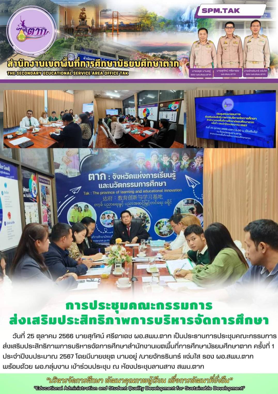 วันที่ 25 ตุลาคม 2566 นายสุทัศน์ ศรีดาเดช ผอ.สพม.ตาก เป็นประธานการประชุมคณะกรรมการ ส่งเสริมประสิทธิภาพการบริหารจัดการศึกษาสำนักงานเขตพื้นที่การศึกษามัธยมศึกษาตาก ครั้งที่ 1 ประจำปีงบประมาณ 2567 โดยมีนายชยุต นามอยู่ /นายจักรรินทร์ แจ่มใส รอง ผอ.สพม.ตาก พร้อมด้วย ผอ.กลุ่มงาน เข้าร่วมประชุม ณ ห้องประชุมลานสาง สพม.ตาก