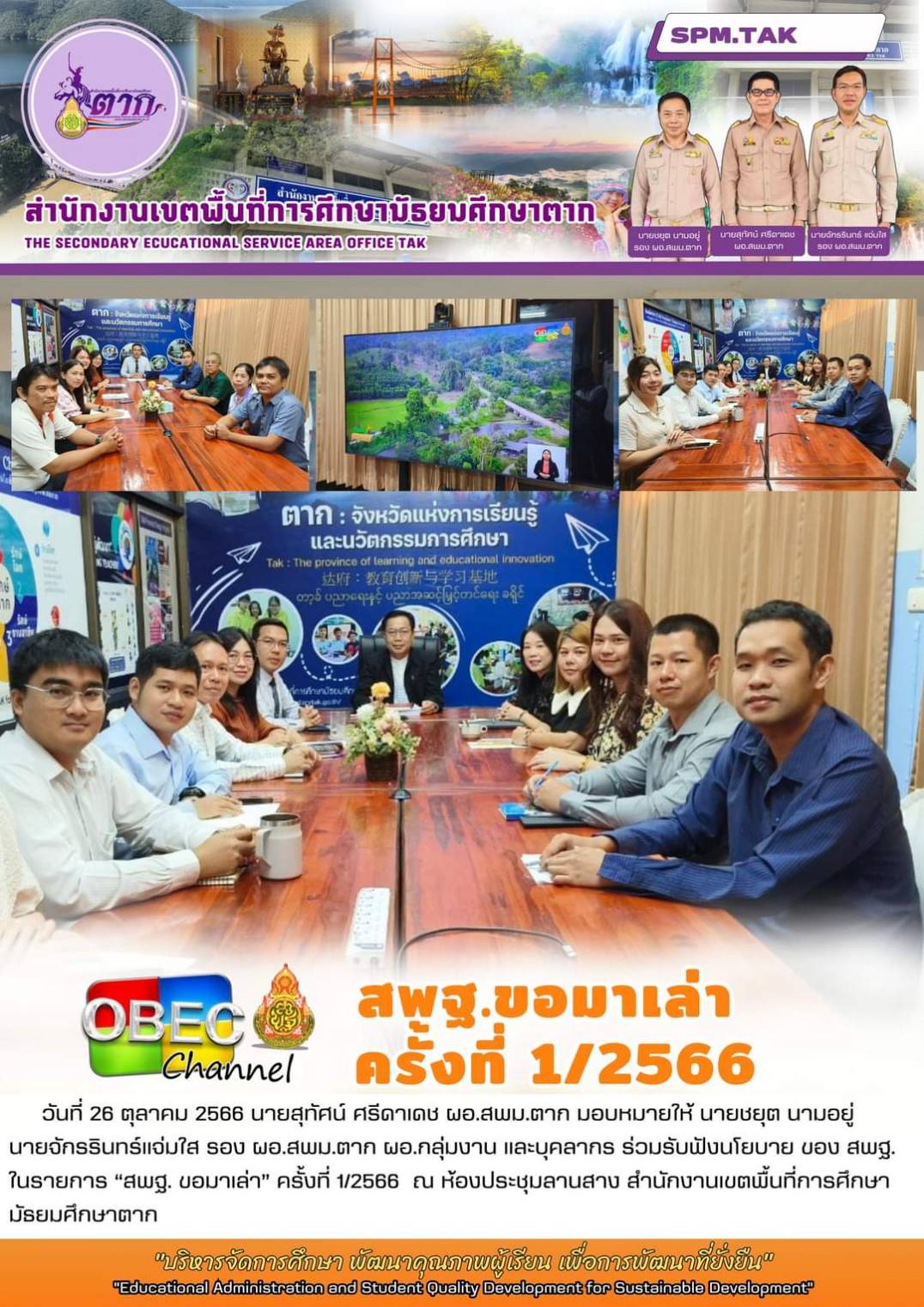 วันที่ 26 ตุลาคม 2566 นายสุทัศน์ ศรีดาเดช ผอ.สพม.ตาก มอบหมายให้ นายชยุต นามอยู่ นายจักรรินทร์แจ่มใส รอง ผอ.สพม.ตาก ผอ.กลุ่มงาน และบุคลากร ร่วมรับฟังนโยบาย ของ สพฐ. ในรายการ “สพฐ. ขอมาเล่า” ครั้งที่ 1/2566 ณ ห้องประชุมลานสาง สำนักงานเขตพื้นที่การศึกษามัธยมศึกษาตาก