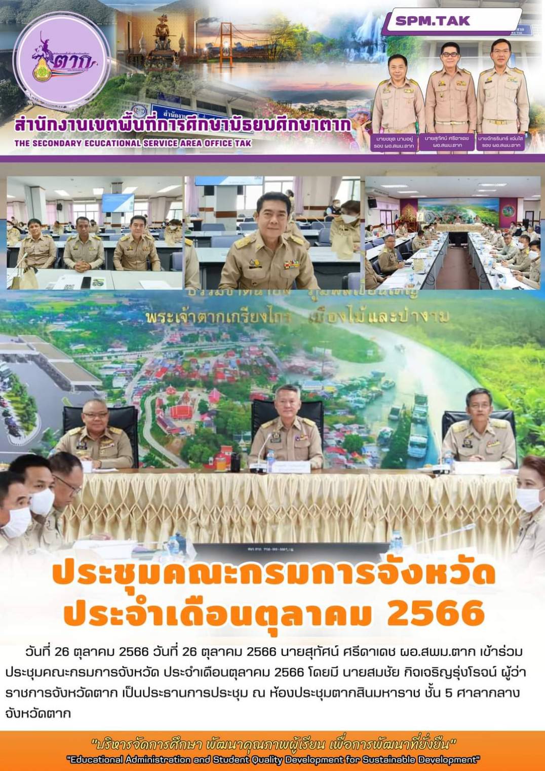 วันที่ 26 ตุลาคม 2566 วันที่ 26 ตุลาคม 2566 นายสุทัศน์ ศรีดาเดช ผอ.สพม.ตาก เข้าร่วมประชุมคณะกรมการจังหวัด ประจำเดือนตุลาคม 2566 โดยมี นายสมชัย กิจเจริญรุ่งโรจน์ ผู้ว่าราชการจังหวัดตาก เป็นประธานการประชุม ณ ห้องประชุมตากสินมหาราช ชั้น 5 ศาลากลางจังหวัดตาก