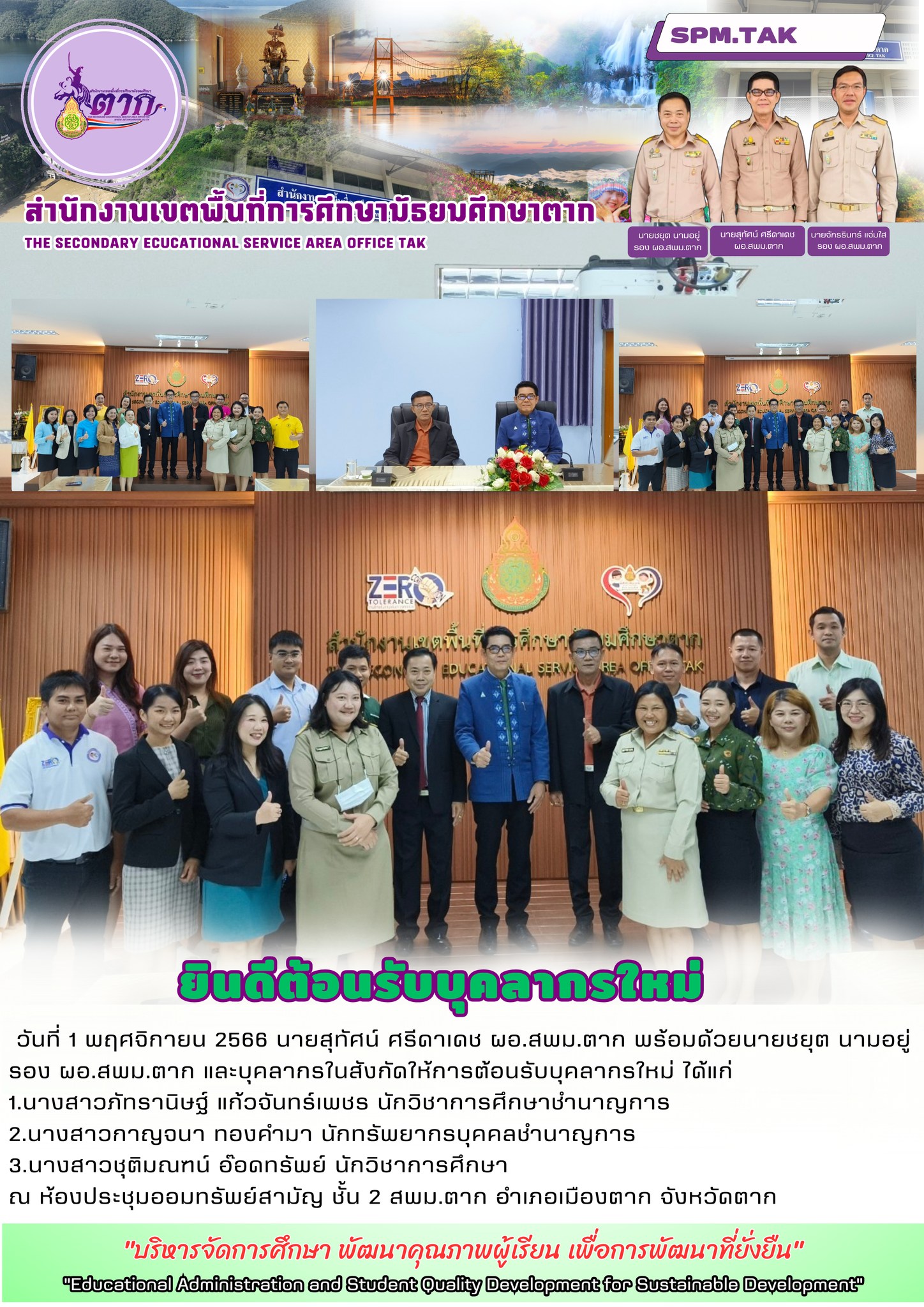 วันที่ 1 พฤศจิกายน 2566 นายสุทัศน์ ศรีดาเดช ผอ.สพม.ตาก พร้อมด้วยนายชยุต นามอยู่รอง ผอ.สพม.ตาก และบุคลากรในสังกัดให้การต้อนรับบุคลากรใหม่ ได้แก่ 1.นางสาวภัทรานิษฐ์ แก้วจันทร์เพชร นักวิชาการศึกษาชำนาญการ 2.นางสาวกาญจนา ทองคำมา นักทรัพยากรบุคคลชำนาญการ 3.นางสาวชุติมณฑน์ อ๊อดทรัพย์ นักวิชาการศึกษา ณ ห้องประชุมออมทรัพย์สามัญ ชั้น 2 สพม.ตาก อำเภอเมืองตาก จังหวัดตาก