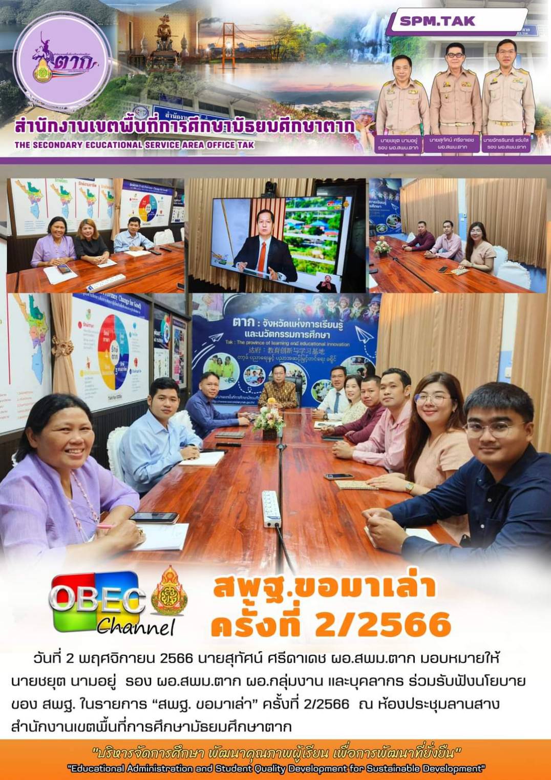 สพฐ.ขอมาเล่า ครั้งที่ 2/2566 วรวุฒิ เนื้อนิ่ม 3 พฤศจิกายน 2566 วันที่ 2 พฤศจิกายน 2566 นายสุทัศน์ ศรีดาเดช ผอ.สพม.ตาก มอบหมายให้ นายชยุต นามอยู่ รอง ผอ.สพม.ตาก ผอ.กลุ่มงาน และบุคลากร ร่วมรับฟังนโยบาย ของ สพฐ. ในรายการ “สพฐ. ขอมาเล่า” ครั้งที่ 2/2566 ณ ห้องประชุมลานสาง สำนักงานเขตพื้นที่การศึกษามัธยมศึกษาตาก จำนวนคนดู 12