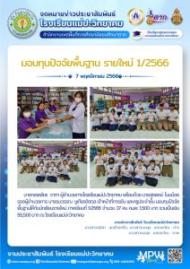 นางทองเพียร วาทา ผู้อำนวยการโรงเรียนแม่ปะวิทยาคม พร้อมด้วย นายสุรพงษ์ โนนน้อย รองผู้อำนวยการ นางธนวรรณ ชูเกียรติตกุล เจ้าหน้าที่การเงิน เเละครูประจำชั้น มอบทุนปัจจัยพื้นฐานให้กับนักเรียนรายใหม่ ภาคเรียนที่ 1/2566 จำนวน 37 คน คนละ 1,500 บาท รวมเป็นเงิน 55,500 บาท ณ โรงเรียนแม่ปะวิทยาคม