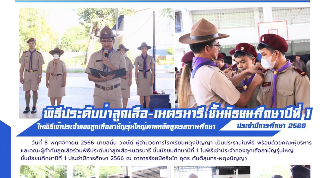 วันที่ 8 พฤศจิกายน 2566 นายสนั่น วงษ์ดี ผู้อำนวยการโรงเรียนผดุงปัญญา เป็นประธานในพีธี พร้อมด้วยรองผู้อำนวยการและคณะผู้กำกับลูกเสือร่วม ในพิธีเข้าประจำกองลูกเสือสามัญรุ่นใหญ่ ชั้นมัธยมศึกษาปีที่ 1 ประจำปีการศึกษา 2566 ณ อาคารร้อยปีศรีผไท อุดร ตันติสุนทร