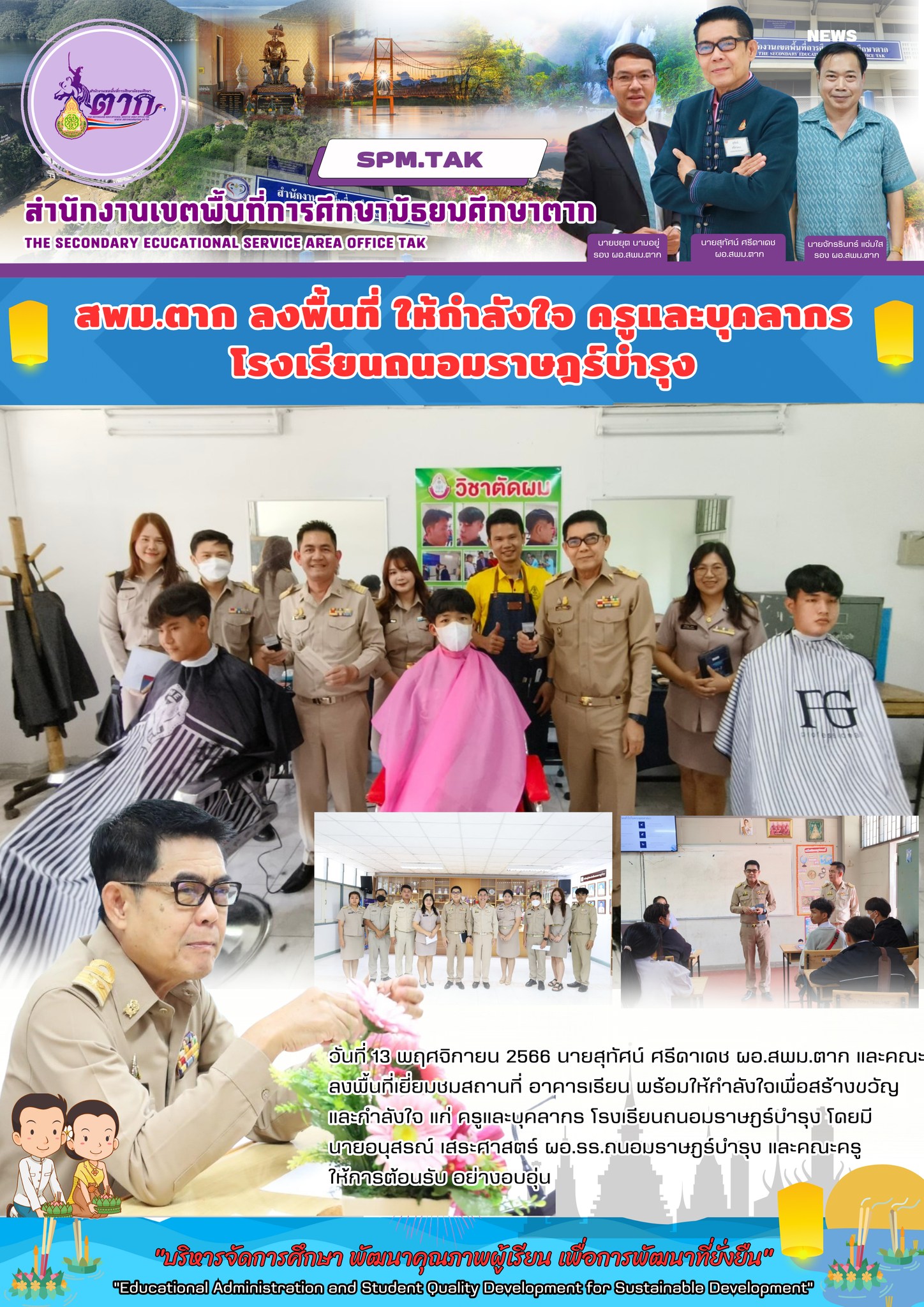 วันที่ 13 พฤศจิกายน 2566 นายสุทัศน์ ศรีดาเดช ผอ.สพม.ตาก และคณะ ลงพื้นที่เยี่ยมชมสถานที่ อาคารเรียน พร้อมให้กำลังใจเพื่อสร้างขวัญและกำลังใจ แก่ ครูและบุคลากรโรงเรียนถนอมราษฎร์บำรุง โดยมี นายอนุสรณ์ เสระศาสตร์ ผอ.รร.ถนอมราษฎร์บำรุง และคณะครู ให้การต้อนรับ อย่างอบอุ่น
