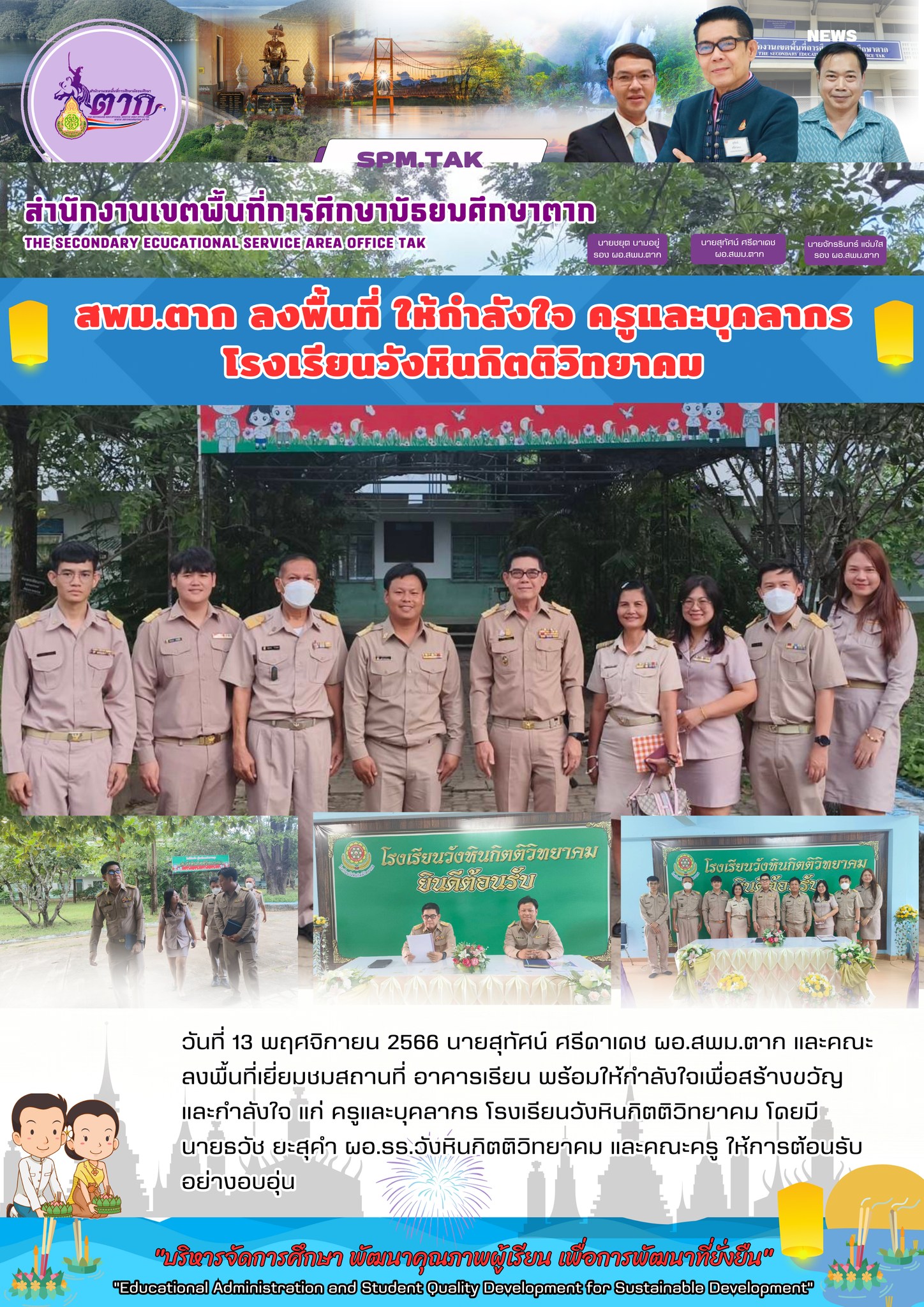 วันที่ 13 พฤศจิกายน 2566 นายสุทัศน์ ศรีดาเดช ผอ.สพม.ตาก และคณะ ลงพื้นที่เยี่ยมชมสถานที่ อาคารเรียน พร้อมให้กำลังใจเพื่อสร้างขวัญ และกำลังใจ แก่ ครูและบุคลากร โรงเรียนวังหินกิตติวิทยาคม โดยมี นายธวัช ยะสุคำ ผอ.รร.วังหินกิตติวิทยาคม และคณะครู ให้การต้อนรับ อย่างอบอุ่น