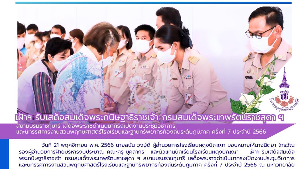 วันที่ 21 พฤศจิกายน พ.ศ. 2566 นายสนั่น วงษ์ดี ผู้อำนวยการโรงเรียนผดุงปัญญา มอบหมายให้นางนิตยา ไกรวัณ รองผู้อำนวยการฝ่ายบริหารงบประมาณ คณะครู บุคลากร และตัวแทนนักเรียนโรงเรียนผดุงปัญญา เฝ้าฯ รับเสด็จสมเด็จพระกนิษฐาธิราชเจ้า กรมสมเด็จพระเทพรัตนราชสุดา ฯ สยามบรมราชกุมารี เสด็จพระราชดำเนินมาทรงเปิดงานประชุมวิชาการ และนิทรรศการงานสวนพฤกษศาสตร์โรงเรียนและฐานทรัพยากรท้องถิ่นระดับภูมิภาค ครั้งที่ 7 ประจำปี 2566 ณ มหาวิทยาลัยราชภัฏเชียงใหม่ ศูนย์แม่ริม จังหวัดเชียงใหม่