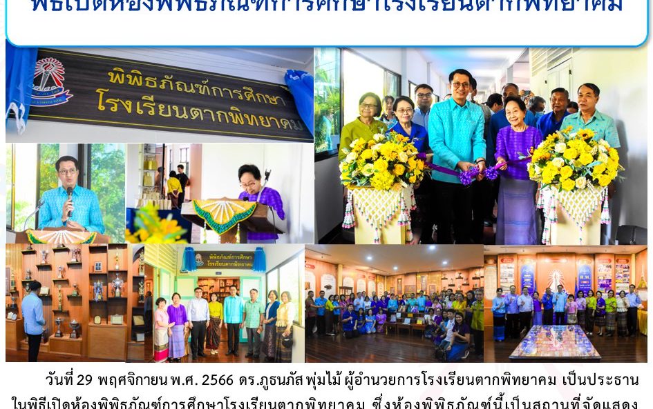 วันที่ 29 พฤศจิกายน พ.ศ. 2566 ดร.ภูธนภัส พุ่มไม้ ผู้อำนวยการโรงเรียนตากพิทยาคม เป็นประธานในพิธีเปิดห้องพิพิธภัณฑ์การศึกษาโรงเรียนตากพิทยาคม ซึ่งห้องพิพิธภัณฑ์นี้เป็นสถานที่จัดแสดงประวัติความเป็นมา คุณความดี รวมถึงการจัดการศึกษา ผู้บริหาร ครู และศิษย์เก่าที่ควรแก่การจัดแสดงให้ปรากฏเป็นเกียรติประวัติของโรงเรียน โดยชมรมครูเก่าตากพิทยาคมเป็นผู้รวบรวมข้อมูลหลักฐานและสิ่งของต่าง ๆ จากผู้ที่มีความเกี่ยวข้องกับโรงเรียนหลายฝ่าย จำแนกการนำเสนออย่างเป็นระบบระเบียบและมีรูปแบบที่สวยงามสมศักดิ์ศรีโรงเรียนประจำจังหวัด ณ ห้องพิพิธภัณฑ์การศึกษาโรงเรียนตากพิทยาคม อาคารตากสิน โรงเรียนตากพิทยาคม