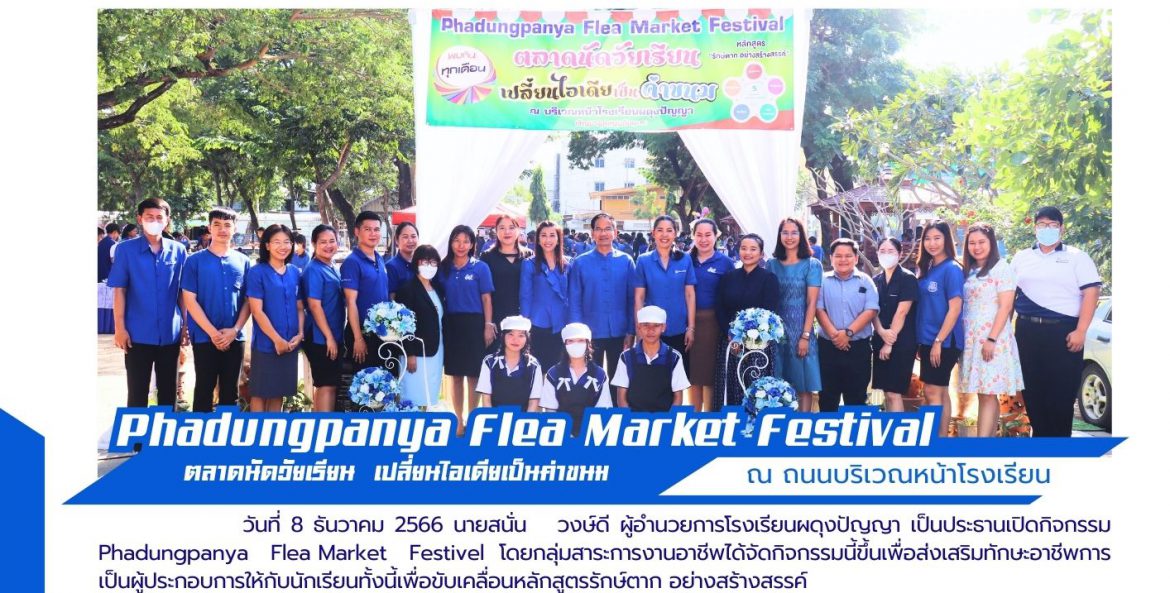 วันที่ 8 ธันวาคม 2566 นายสนั่น วงษ์ดี ผู้อำนวยการโรงเรียนผดุงปัญญา เป็นประธานเปิดกิจกรรม Phadungpanya Flea Market Festivel โดยกลุ่มสาระการงานอาชีพได้จัดกิจกรรมนี้ขึ้นเพื่อส่งเสริมทักษะอาชีพการเป็นผู้ประกอบการให้กับนักเรียนทั้งนี้เพื่อขับเคลื่อนหลักสูตรรักษ์ตาก อย่างสร้างสรรค์