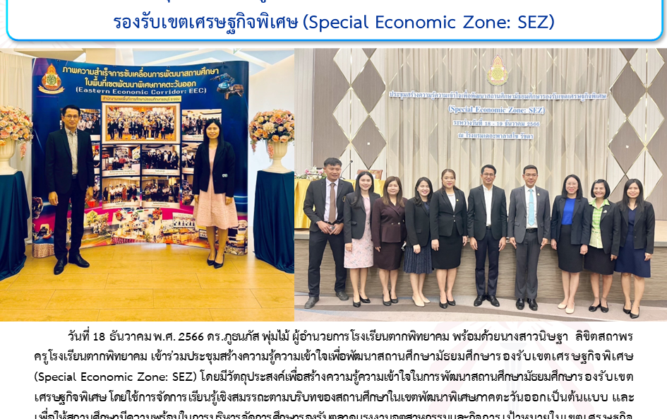 วันที่ 18 ธันวาคม พ.ศ. 2566 ดร.ภูธนภัส พุ่มไม้ ผู้อำนวยการโรงเรียนตากพิทยาคม พร้อมด้วยนางสาวนิษฐา ลิขิตสถาพร ครูโรงเรียนตากพิทยาคม เข้าร่วมประชุมสร้างความรู้ความเข้าใจเพื่อพัฒนาสถานศึกษามัธยมศึกษารองรับเขตเศรษฐกิจพิเศษ (Special Economic Zone: SEZ) โดยมีวัตถุประสงค์เพื่อสร้างความรู้ความเข้าใจในการพัฒนาสถานศึกษามัธยมศึกษารองรับเขตเศรษฐกิจพิเศษ โดยใช้การจัดการเรียนรู้เชิงสมรรถะตามบริบทของสถานศึกษาในเขตพัฒนาพิเศษภาคตะวันออกเป็นต้นแบบ และเพื่อให้สถานศึกษามีความพร้อมในการบริหารจัดการศึกษารองรับตลาดแรงงานอุตสาหกรรมและกิจการเป้าหมายในเขตเศรษฐกิจพิเศษ รวมทั้งส่งเสริมการพัฒนาการจัดการศึกษาเชิงพื้นที่ควบคู่กับการมีส่วนร่วมในภาคส่วนที่เกี่ยวข้อง ระหว่างวันที่ 18-19 ธันวาคม พ.ศ. 2566 ณ โรงแรมเดอะพาลาสโซ รัชดา กรุงเทพมหานคร