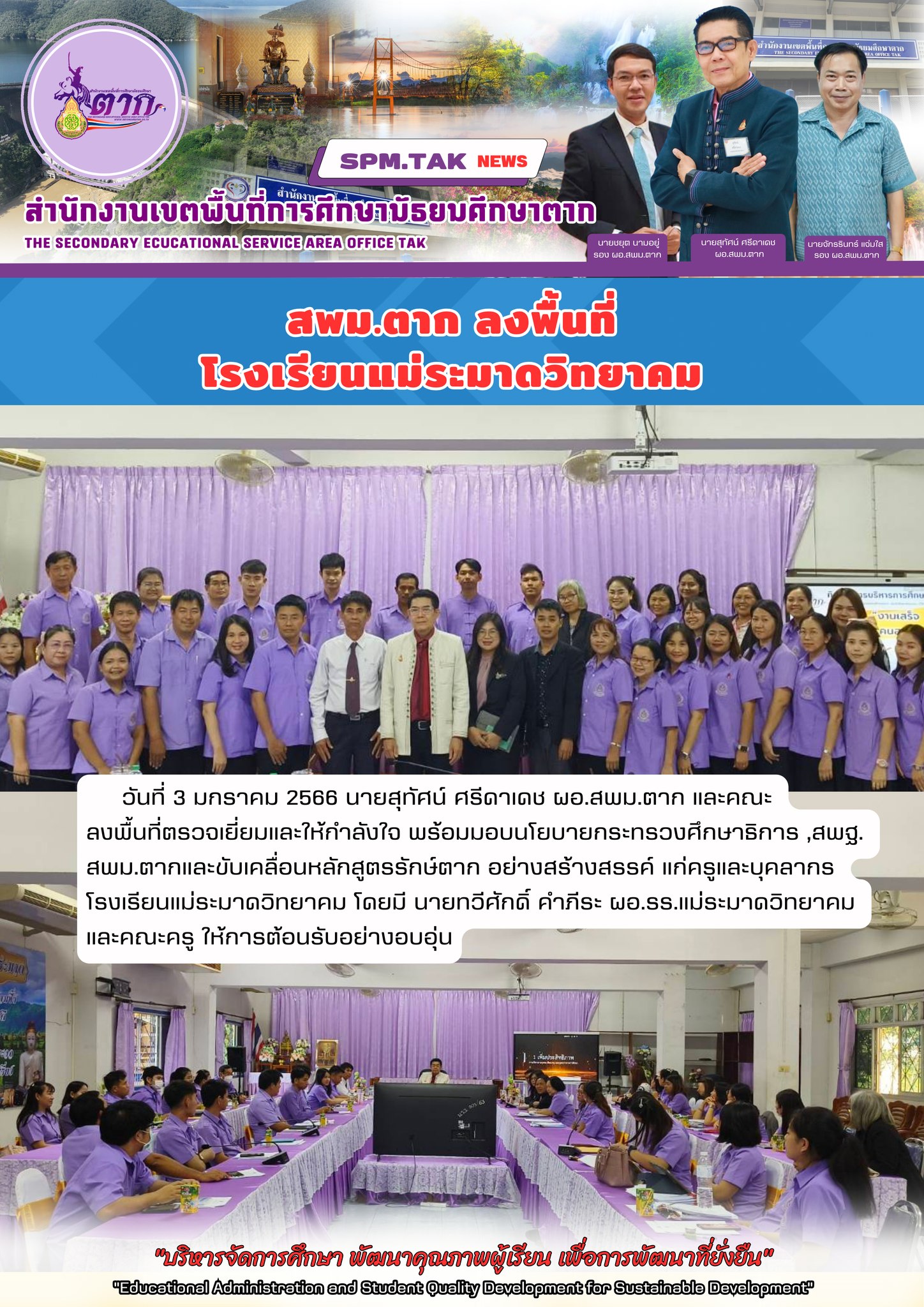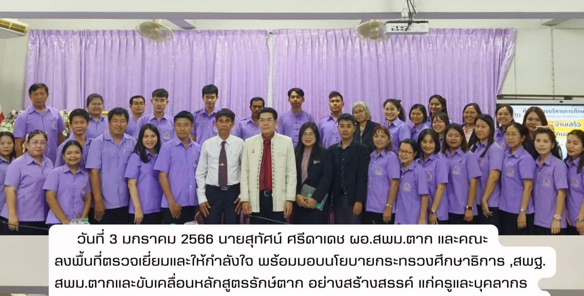 วันที่ 3 มกราคม 2566 นายสุทัศน์ ศรีดาเดช ผอ.สพม.ตาก และคณะลงพื้นที่ตรวจเยี่ยมและให้กำลังใจ พร้อมมอบนโยบายกระทรวงศึกษาธิการ ,สพฐ. สพม.ตากและขับเคลื่อนหลักสูตรรักษ์ตาก อย่างสร้างสรรค์ แก่ครูและบุคลากร โรงเรียนแม่ระมาดวิทยาคม โดยมี นายทวีศักดิ์ คำภีระ ผอ.รร.แม่ระมาดวิทยาคมและคณะครู ให้การต้อนรับอย่างอบอุ่น