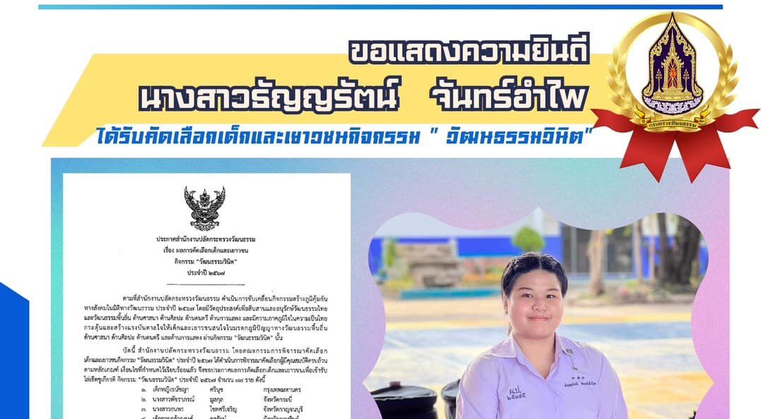 วันที่ 9 มกราคม 2567 ผู้บริหาร คณะครู และนักเรียนโรงเรียนผดุงปัญญา ขอแสดงความยินดีกับ นางสาวธัญญรัตน์ จันทร์อำไพ นักเรียนชั้นมัธยมศึกษาปีที่ 6/1 ได้รับคัดเลือกเด็กและเยาวชนกิจกรรม “วัฒนธรรมวินิต” เพื่อเข้ารับโล่เชิดชูเกียรติ ประจำปี 2567 จากสำนักงานปลัดกระทรวงวัฒนธรรม