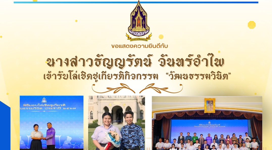 วันที่ 13 มกราคม 2567 นายสนั่น วงษ์ดี ผู้อำนวยการโรงเรียนผดุงปัญญา มอบหมายให้นายพีรพัฒน์ พรมพล นำนักเรียน นางสาวธัญญรัตน์ จันทร์อำไพ นักเรียนชั้นมัธยมศึกษาปีที่ 6/1 เข้ารับโล่เชิดชูเกียรติกิจกรรม “วัฒนธรรมวินิจ” ประจำปี 2567 จากท่านรัฐมนตรีว่าการกระทรวงวัฒนธรรม นายเสริมศักดิ์ พงษ์พานิช ณ ตึกสันติไมตรี ทำเนียบรัฐบาล