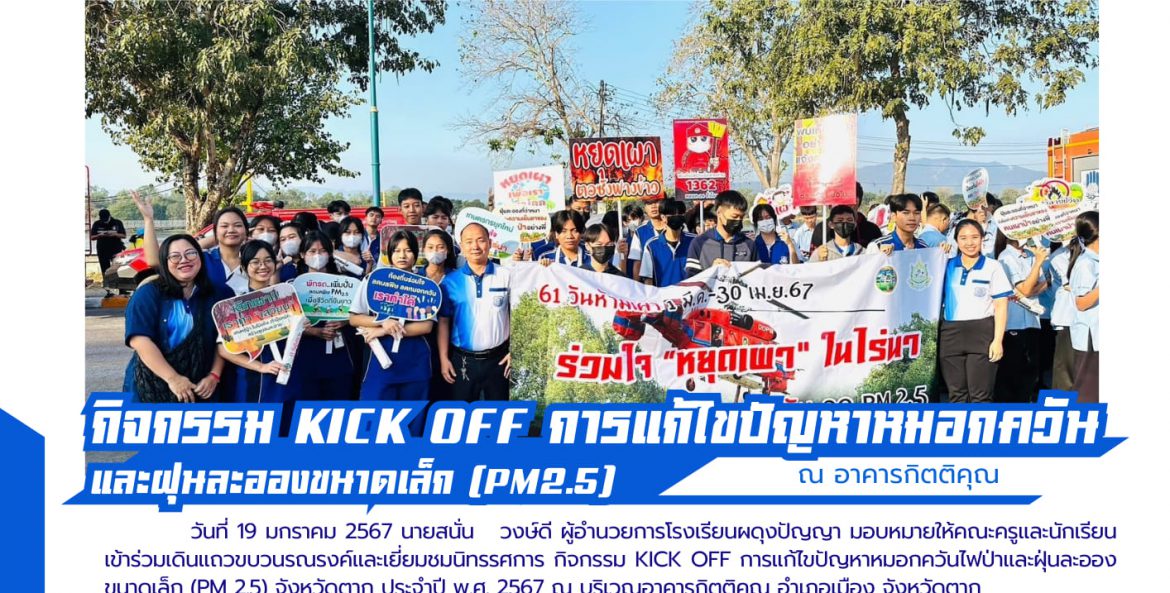 วันที่ 19 มกราคม 2567 นายสนั่น วงษ์ดี ผู้อำนวยการโรงเรียนผดุงปัญญา มอบหมายให้คณะครูและนักเรียนเข้าร่วมเดินแถวขบวนรณรงค์และเยี่ยมชมนิทรรศการ กิจกรรม KICK OFF การแก้ไขปัญหาหมอกควันไฟป่าและฝุ่นละอองขนาดเล็ก (PM 2.5) จังหวัดตาก ประจำปี พ.ศ. 2567 ณ บริเวณอาคารกิตติคุณ อำเภอเมือง จังหวัดตาก