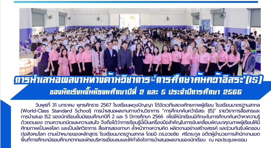 วันพุธที่ 31 มกราคม พุทธศักราช 2567 โรงเรียนผดุงปัญญา ได้จัดเวทีแสดงศักยภาพผู้เรียน โรงเรียนมาตรฐานสากล (World-Class Standard School) การนำเสนอผลงานทางด้านวิชาการ “การศึกษาค้นคว้าอิสระ (IS)” รายวิชาการสื่อสารและการนำเสนอ IS2 ของนักเรียนชั้นมัธยมศึกษาปีที่ 2 และ 5 ปีการศึกษา 2566 เพื่อให้นักเรียนมีทักษะในการศึกษาค้นคว้าหาความรู้ด้วยตนเอง ตามความถนัดและความสนใจ จึงถือได้ว่าการเรียนรู้นี้เป็นเครื่องมือสำคัญในการขับเคลื่อนพัฒนาคุณภาพผู้เรียนให้มีศักยภาพเป็นพลโลก และเป็นเลิศวิชาการ สื่อสารสองภาษา ล้ำหน้าทางความคิด ผลิตงานอย่างสร้างสรรค์ และร่วมกันรับผิดชอบต่อสังคมโลก ตามเป้าหมายของหลักสูตร โรงเรียนมาตรฐานสากล โดยมี ดร.อวยชัย ศรีตระกูล อดีตผู้อำนวยการสำนักงานเขตพื้นที่การศึกษามัธยมศึกษาตากและฝ่ายบริหารเยี่ยมชมและให้กำลังใจการนำเสนอผลงานของนักเรียน ณ หอประชุมพะยอม