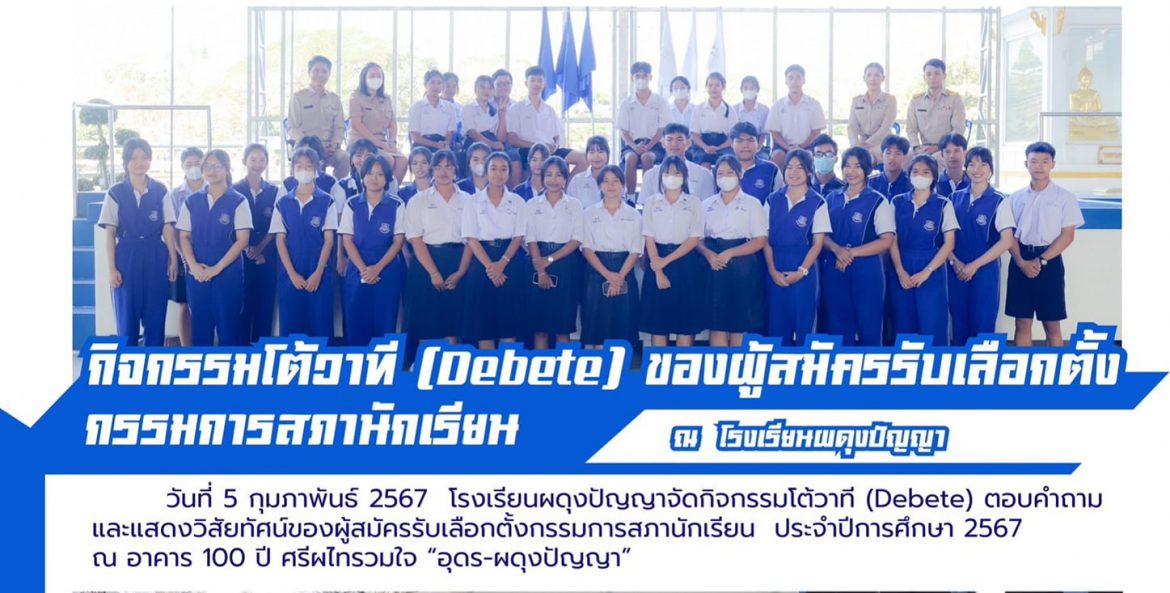 โรงเรียนผดุงปัญญาจัดกิจกรรมโต้วาที (Debete) นายวิบูลย์ เมฆเสือ 5 กุมภาพันธ์ 2567 วันที่ 5 กุมภาพันธ์ 2567 โรงเรียนผดุงปัญญาจัดกิจกรรมโต้วาที (Debete) ตอบคำถามและแสดงวิสัยทัศน์ของผู้สมัครรับเลือกตั้งกรรมการสภานักเรียน ประจำปีการศึกษา 2567 ณ อาคาร 100 ปี ศรีผไทรวมใจ “อุดร-ผดุงปัญญา” จำนวนคนดู 1