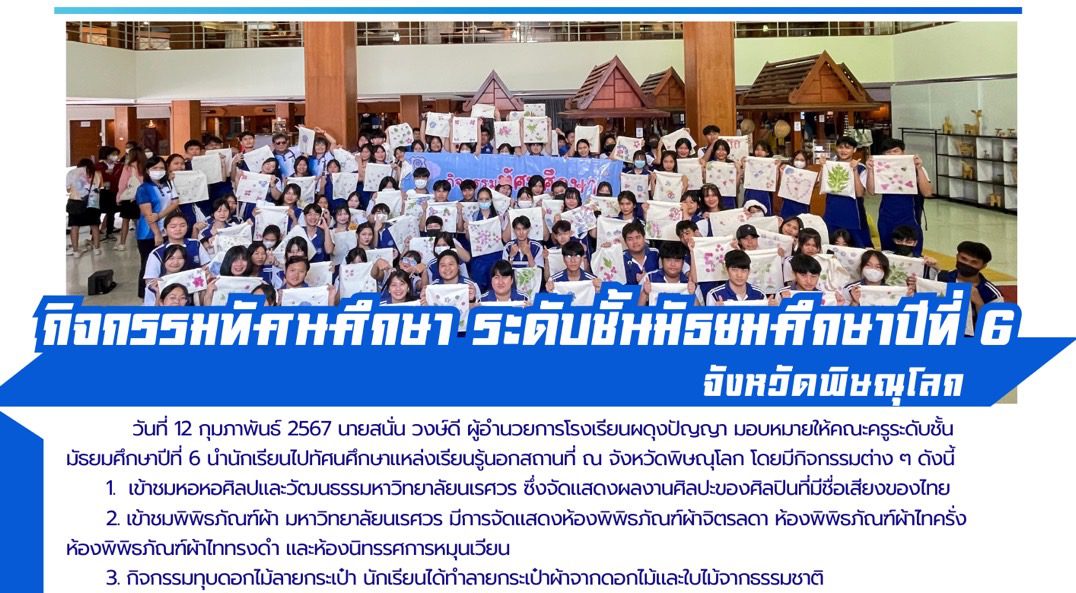 วันที่ 12 กุมภาพันธ์ 2567 นายสนั่น วงษ์ดี ผู้อำนวยการโรงเรียนผดุงปัญญา มอบหมายให้คณะครูระดับชั้นมัธยมศึกษาปีที่ 6 นำนักเรียนไปทัศนศึกษาแหล่งเรียนรู้นอกสถานที่ ณ จังหวัดพิษณุโลก โดยมีกิจกรรมต่าง ๆ ดังนี้
