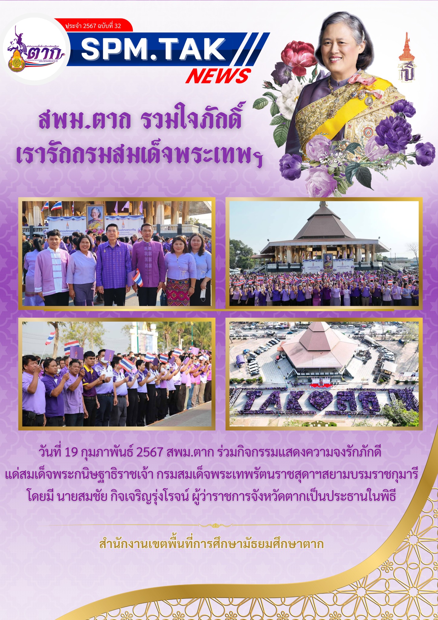 สพม.ตาก ร่วมกิจกรรม รวมพลังจงรักภักดี กรมสมเด็จพระเทพฯ วรวุฒิ เนื้อนิ่ม 19 กุมภาพันธ์ 2567 วันที่ 19 กุมภาพันธ์ 2567 สพม.ตาก ร่วมกิจกรรมแสดงความจงรักภักดีแด่สมเด็จพระกนิษฐาธิราชเจ้า กรมสมเด็จพระเทพรัตนราชสุดาฯสยามบรมราชกุมารีโดยมี นายสมชัย กิจเจริญรุ่งโรจน์ ผู้ว่าราชการจังหวัดตากเป็นประธานในพิธี จำนวนคนดู 7