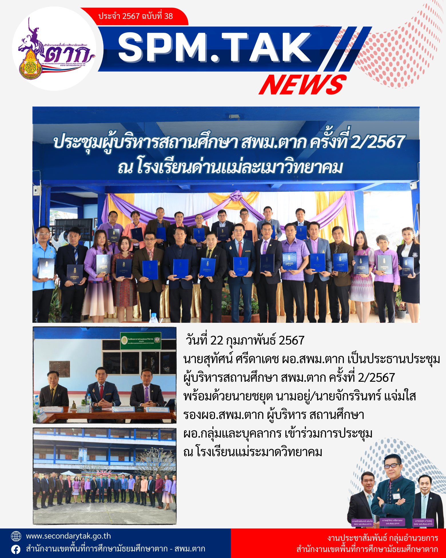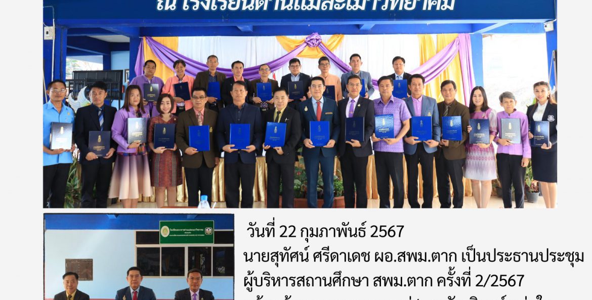 วันที่ 22 กุมภาพันธ์ 2567 นายสุทัศน์ ศรีดาเดช ผอ.สพม.ตาก เป็นประธานประชุมผู้บริหารสถานศึกษาสพม.ตาก ครั้งที่ 2/2567 พร้อมด้วยนายชยุต นามอยู่/นายจักรรินทร์ แจ่มใส รองผอ.สพม.ตาก ผู้บริหาร สถานศึกษา ผอ.กลุ่มและบุคลากร เข้าร่วมการประชุม ณ โรงเรียนแม่ระมาดวิทยาคม