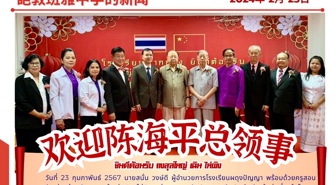ร่วมต้อนรับ กงสุลใหญ่ เฉิน ไห่ผิง แห่งสาธารณรัฐประชาชนจีนประจำเชียงใหม่ นายวิบูลย์ เมฆเสือ 1 มีนาคม 2567 วันที่ 23 กุมภาพันธ์ 2567 นายสนั่น วงษ์ดี ผู้อำนวยการโรงเรียนผดุงปัญญา พร้อมด้วยครูสอนภาษาจีน ร่วมต้อนรับ กงสุลใหญ่ เฉิน ไห่ผิง แห่งสาธารณรัฐประชาชนจีนประจำเชียงใหม่ เนื่องในโอกาสที่ท่านได้มาเยี่ยมชมโรงเรียนตากกวง จำนวนคนดู 2