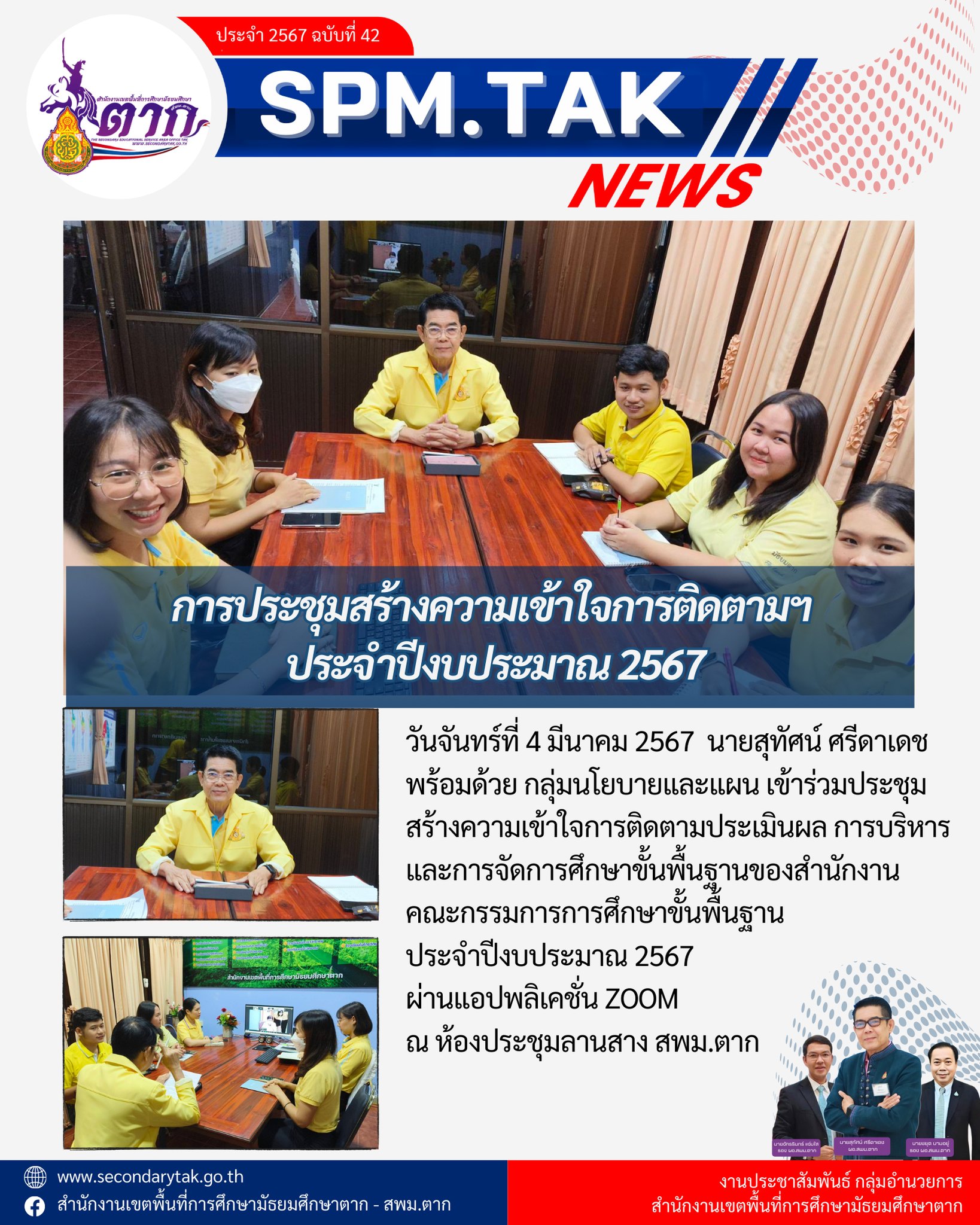 วันจันทร์ที่ 4 มีนาคม 2567 นายสุทัศน์ ศรีดาเดช พร้อมด้วย กลุ่มนโยบายและแผน เข้าร่วมประชุมสร้างความเข้าใจการติดตามประเมินผล การบริหารและการจัดการศึกษาขั้นพื้นฐานของสำนักงานคณะกรรมการการศึกษาขั้นพื้นฐาน ประจำปีงบประมาณ 2567ผ่านแอปพลิเคชั่น ZOOM ณ ห้องประชุมลานสาง สพม.ตาก